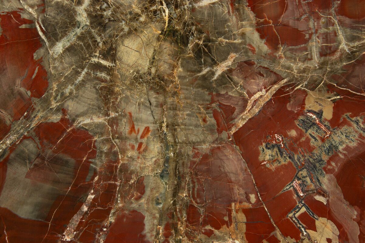 Petrified wood is the name given to wood that has been turned into stone (fossilized) through the process of permineralization. In this process, all of the organic matter becomes replaced by minerals, while much of the original structure, such as tree rings, is retained. For this to happen, the wood needs to be buried in an environment low in oxygen to prevent decomposition and with flowing, mineral-laden water, so minerals may replace structures. The coloration is caused by various minerals/impurities present in the water during fossilization. For example, red colors in many cases can be attributed to iron compounds, greens due to copper, and so on.