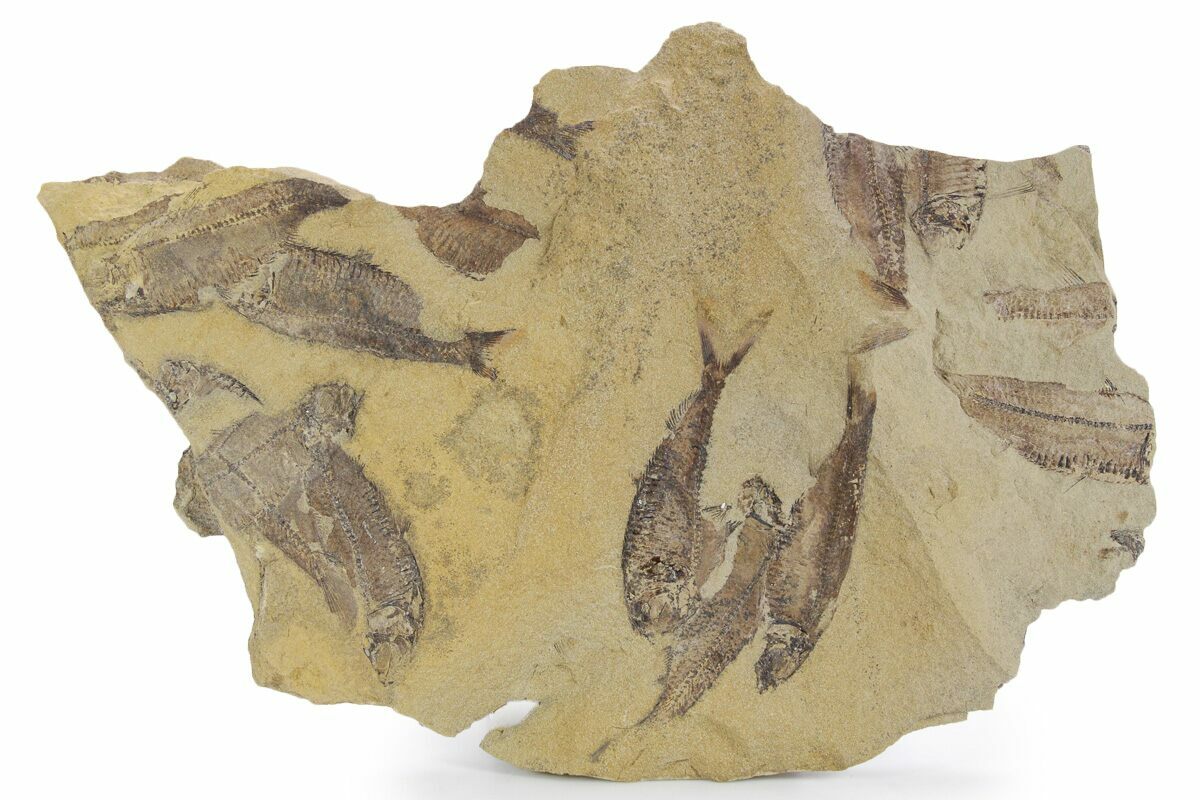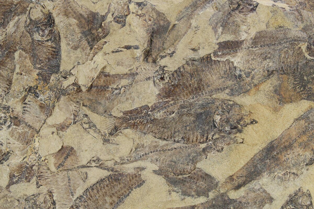 This is a 11.3 x 7.7" mortality plate of detailed fossil herring (Gosiutichthys parvus) from the Green River Formation of Wyoming. It comes from a different location than most of the Green River fish fossils, representing the ancient Lake Gosiute, not Fossil Lake. The preservation is also quite different compared to the fossil fish found in the Fossil Lake deposits, being a course grained mudstone. They are very detailed, with the bony structures, fins, and scales easily seen. Fish can be found on both sides of this plate.