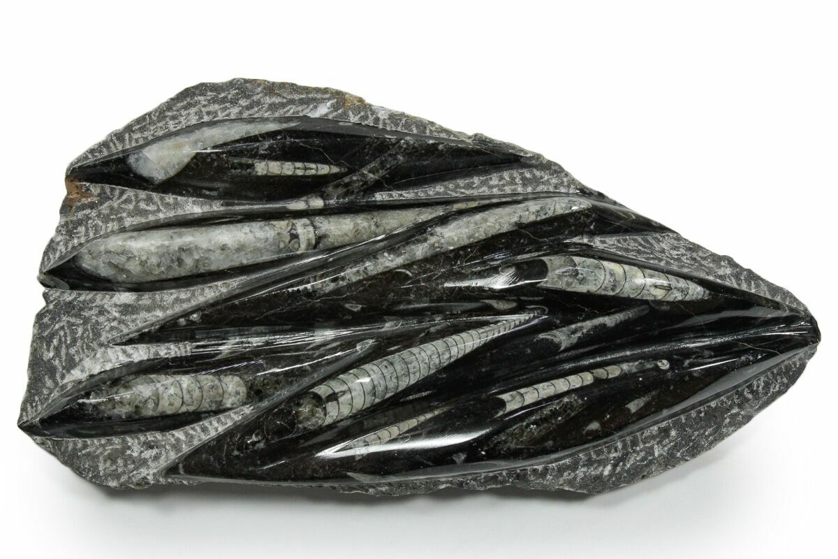 The fossils commonly known as Orthoceras are extinct "straight" cephalopods that lived during the Upper Devonian period around 370 million years ago. Like other cephalopods, they lived inside of their shells, had tentacles they could use to grab food, and used jet propulsion, squirting water to move. The rock containing them is quarried from the Atlas Mountains of Morocco and frequently polished to reveal the fossils and make decorative items with them.