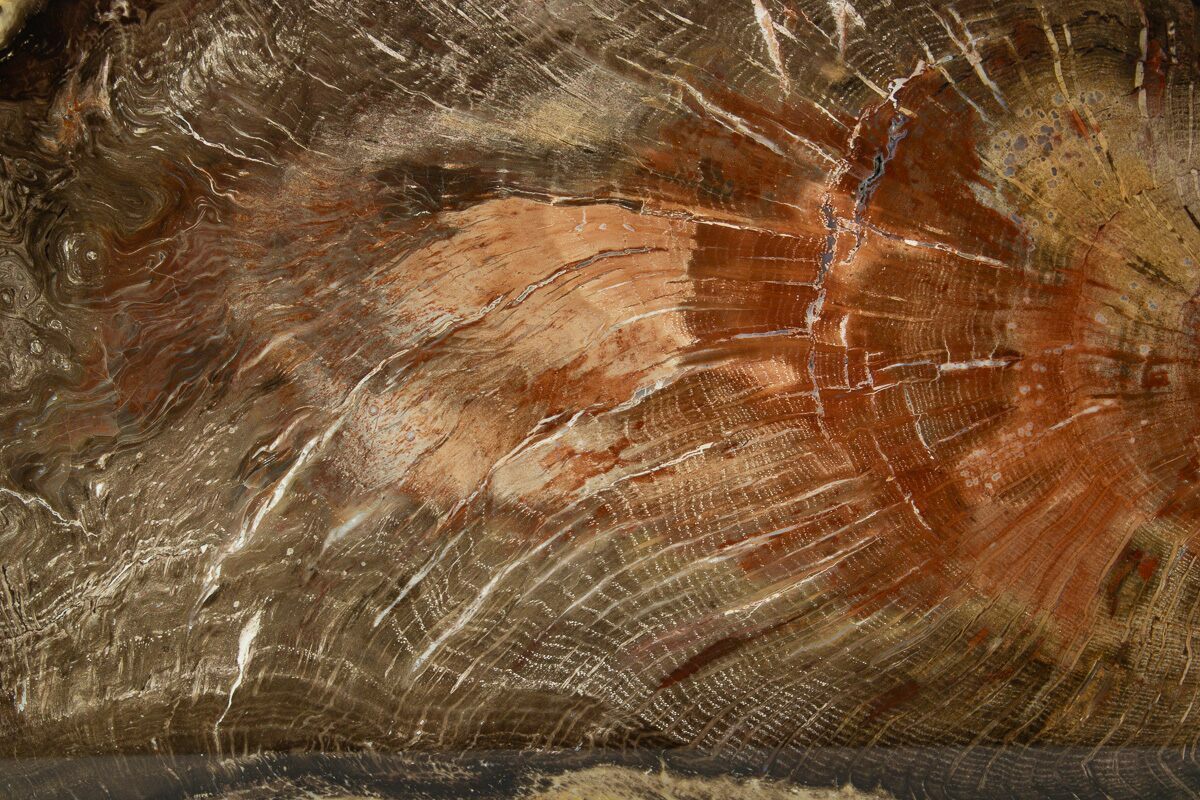 Petrified wood is the name given to wood that has been turned into stone (fossilized) through the process of permineralization. In this process, all of the organic matter becomes replaced by minerals, while much of the original structure, such as tree rings, is retained. For this to happen, the wood needs to be buried in an environment low in oxygen to prevent decomposition and with flowing, mineral-laden water, so minerals may replace structures. The coloration is caused by various minerals/impurities present in the water during fossilization. For example, red colors in many cases can be attributed to iron compounds, greens due to copper, and so on.