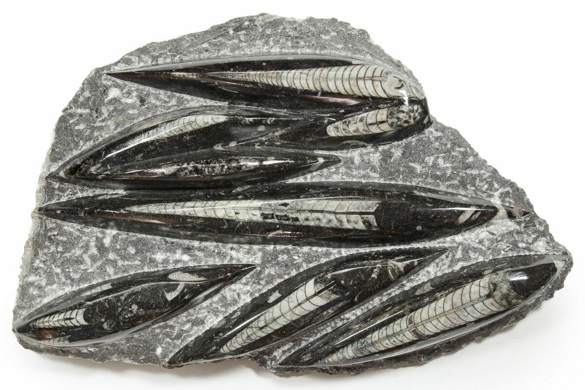 The fossils commonly known as Orthoceras are extinct "straight" cephalopods that lived during the Upper Devonian period around 370 million years ago. Like other cephalopods, they lived inside of their shells, had tentacles they could use to grab food, and used jet propulsion, squirting water to move. The rock containing them is quarried from the Atlas Mountains of Morocco and frequently polished to reveal the fossils and make decorative items with them.
