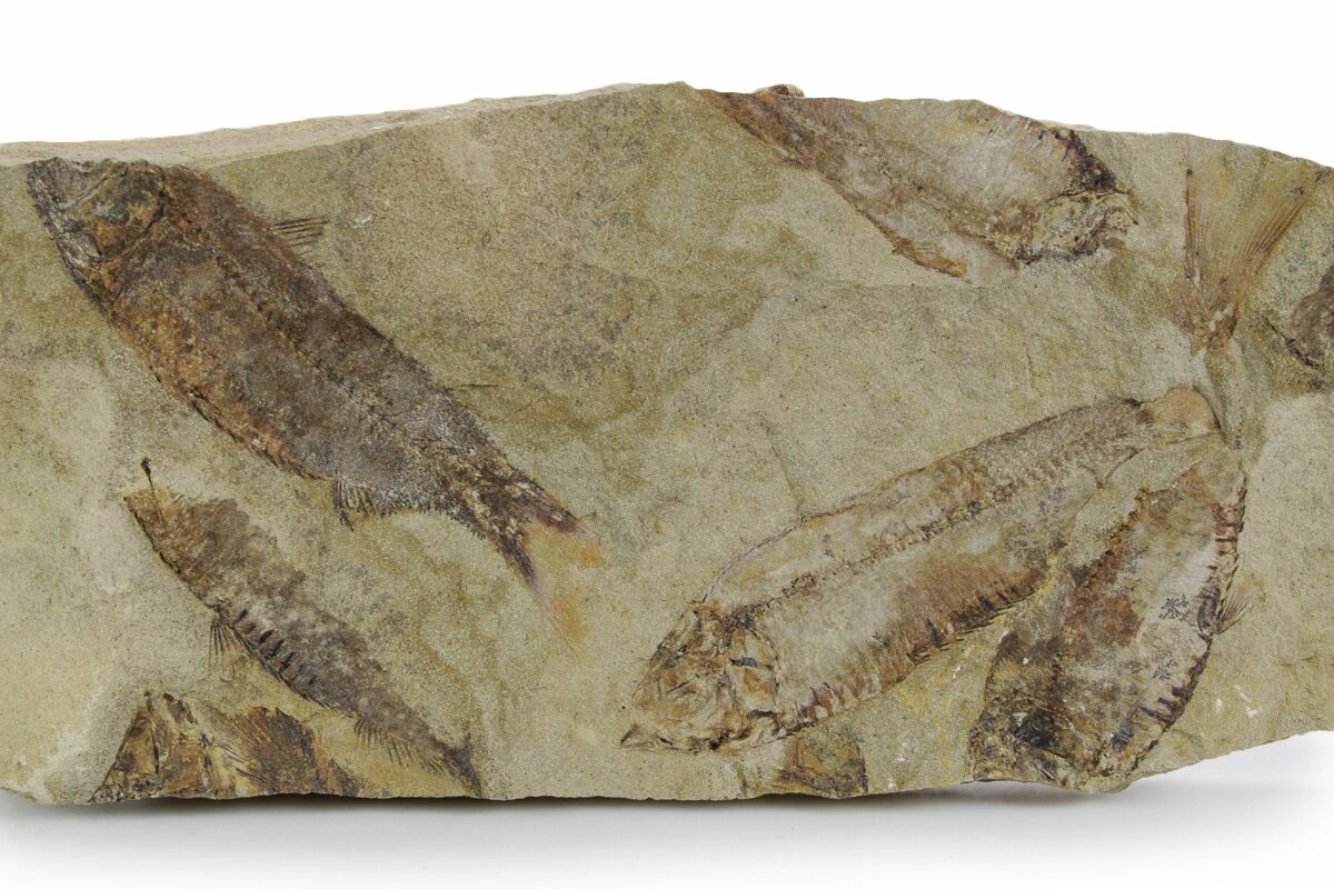 This is a 12.1 x 3.3" mortality plate of detailed fossil herring (Gosiutichthys parvus) from the Green River Formation of Wyoming. It comes from a different location than most of the Green River fish fossils, representing the ancient Lake Gosiute, not Fossil Lake. The preservation is also quite different compared to the fossil fish found in the Fossil Lake deposits, being a course grained mudstone. They are very detailed, with the bony structures, fins, and scales easily seen.