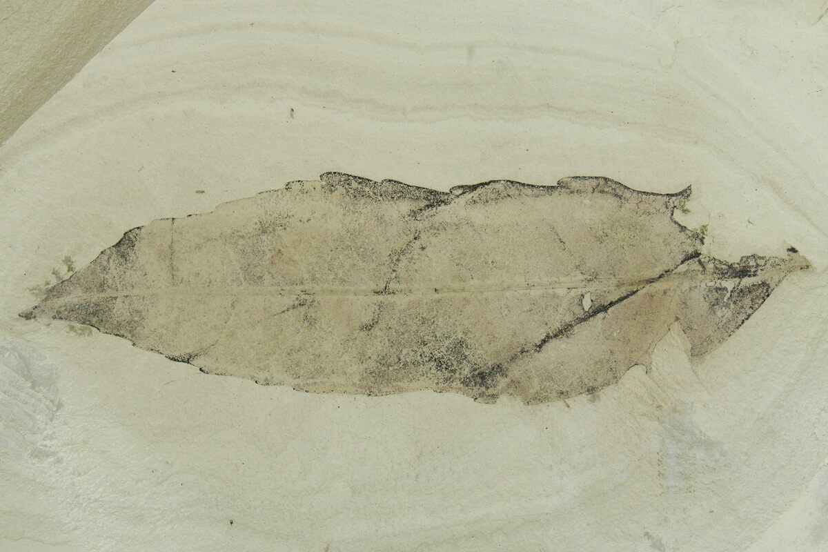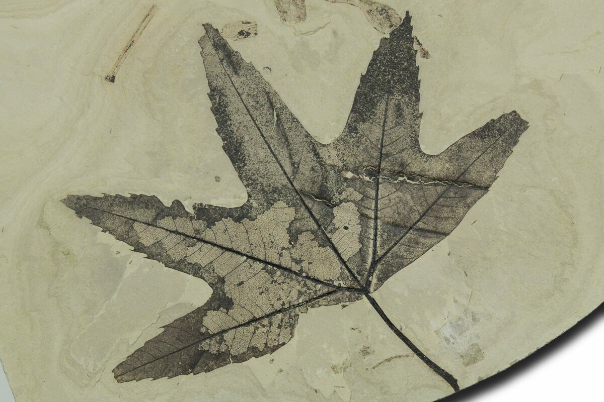 This is a stunning, 12.1" wide leaf fossil plate from the Green River Formation of Uintah County, Utah. It contains two leaves representing the species Macginitiea wyomingensis (sycamore - 6.3" wide) and Allophylus flexifolia (5" long). The sycamore leaf has exceptionally well preserved venation and both leaves show signs of insect predation.
