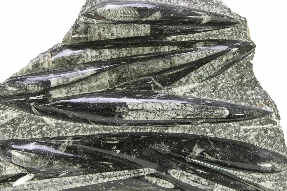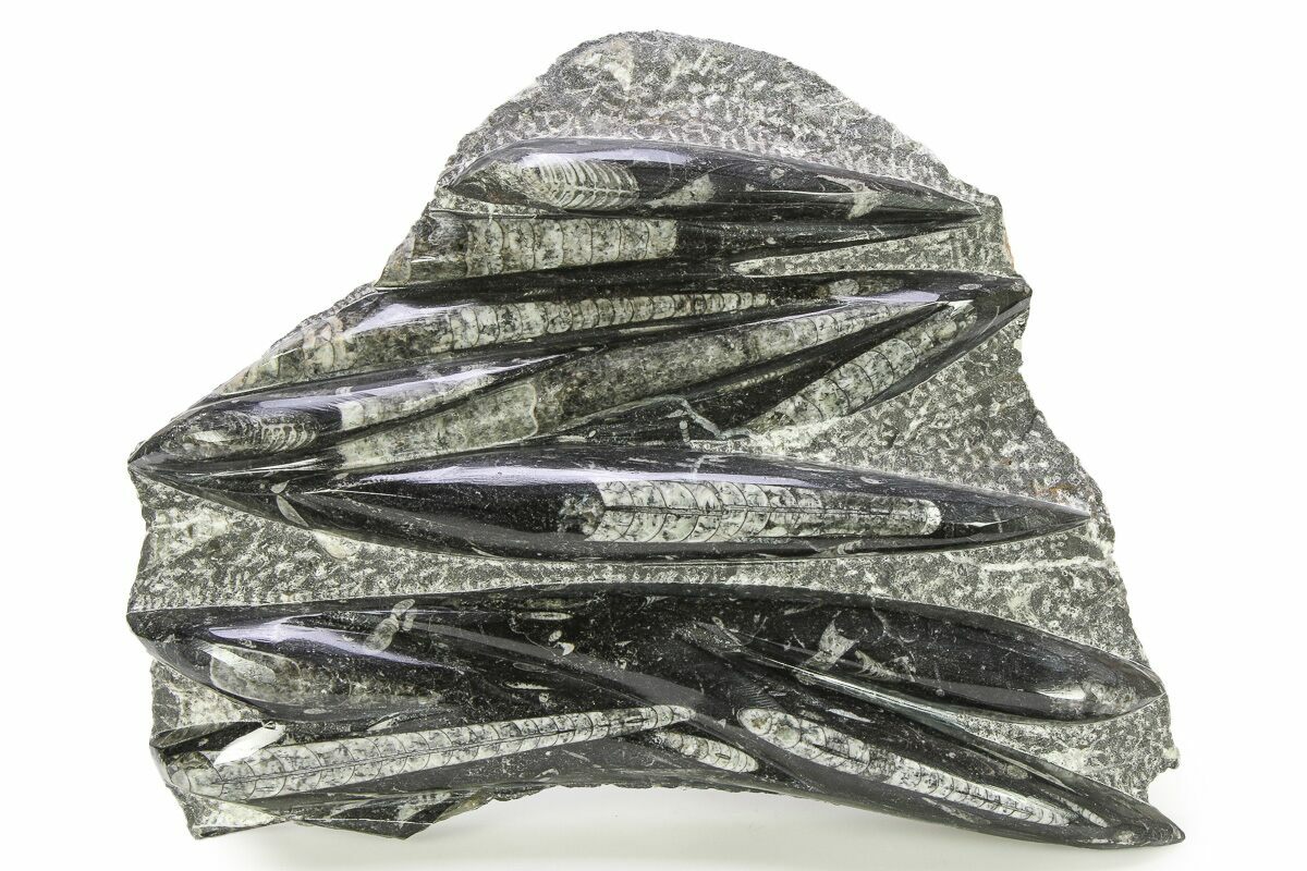 The fossils commonly known as Orthoceras are extinct "straight" cephalopods that lived during the Upper Devonian period around 370 million years ago. Like other cephalopods, they lived inside of their shells, had tentacles they could use to grab food, and used jet propulsion, squirting water to move. The rock containing them is quarried from the Atlas Mountains of Morocco and frequently polished to reveal the fossils and make decorative items with them.