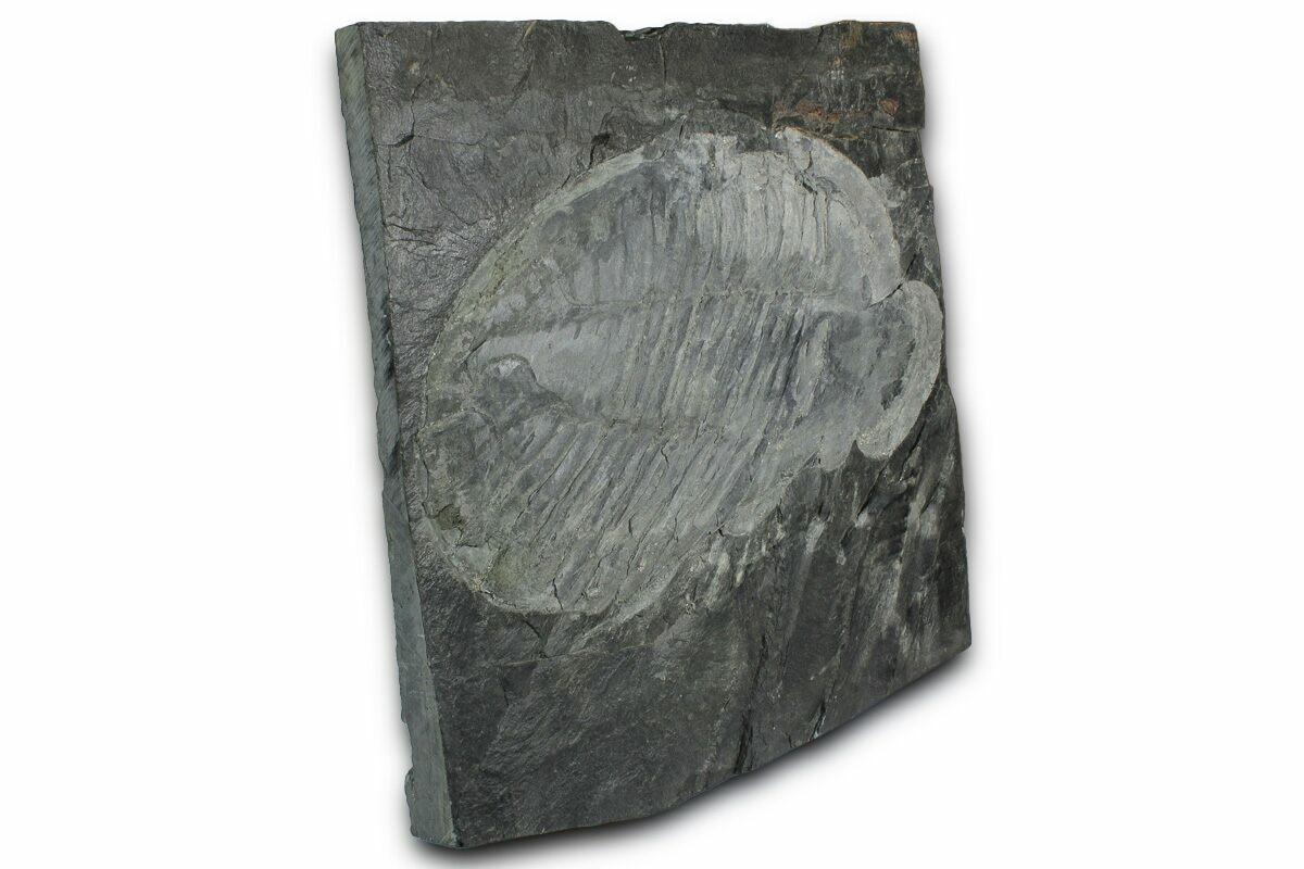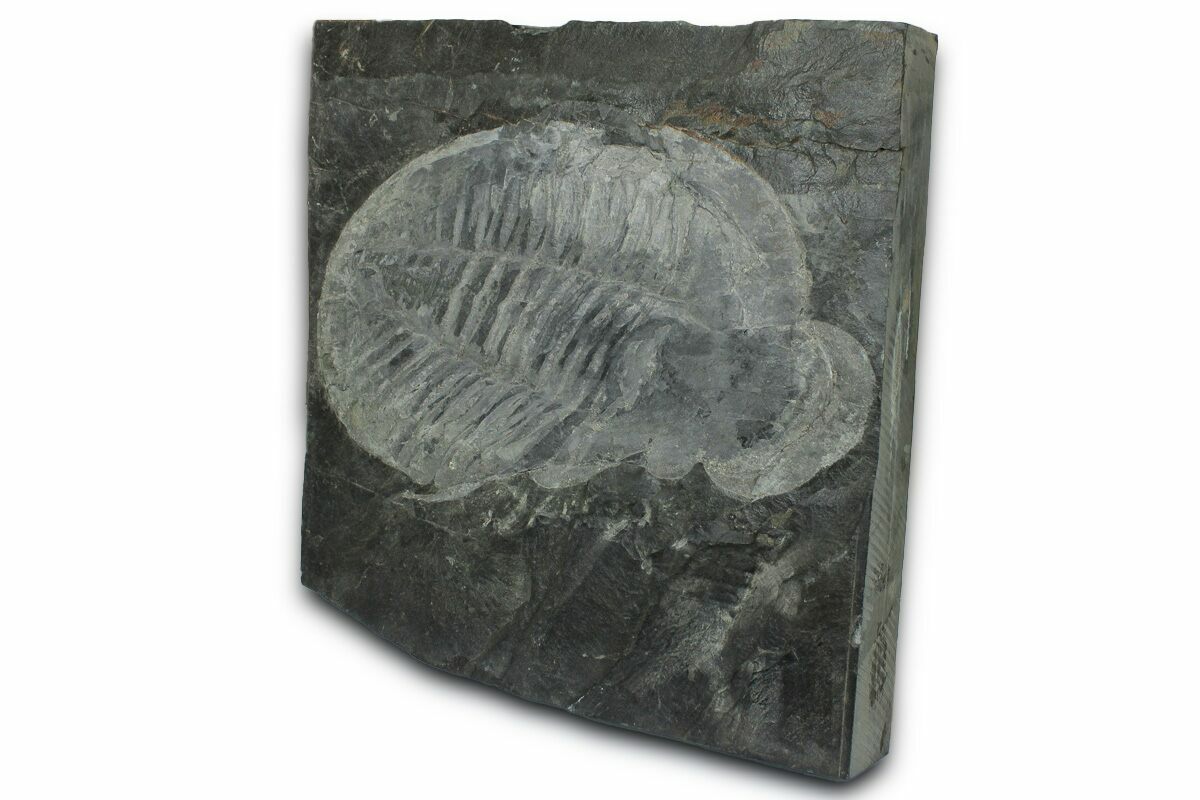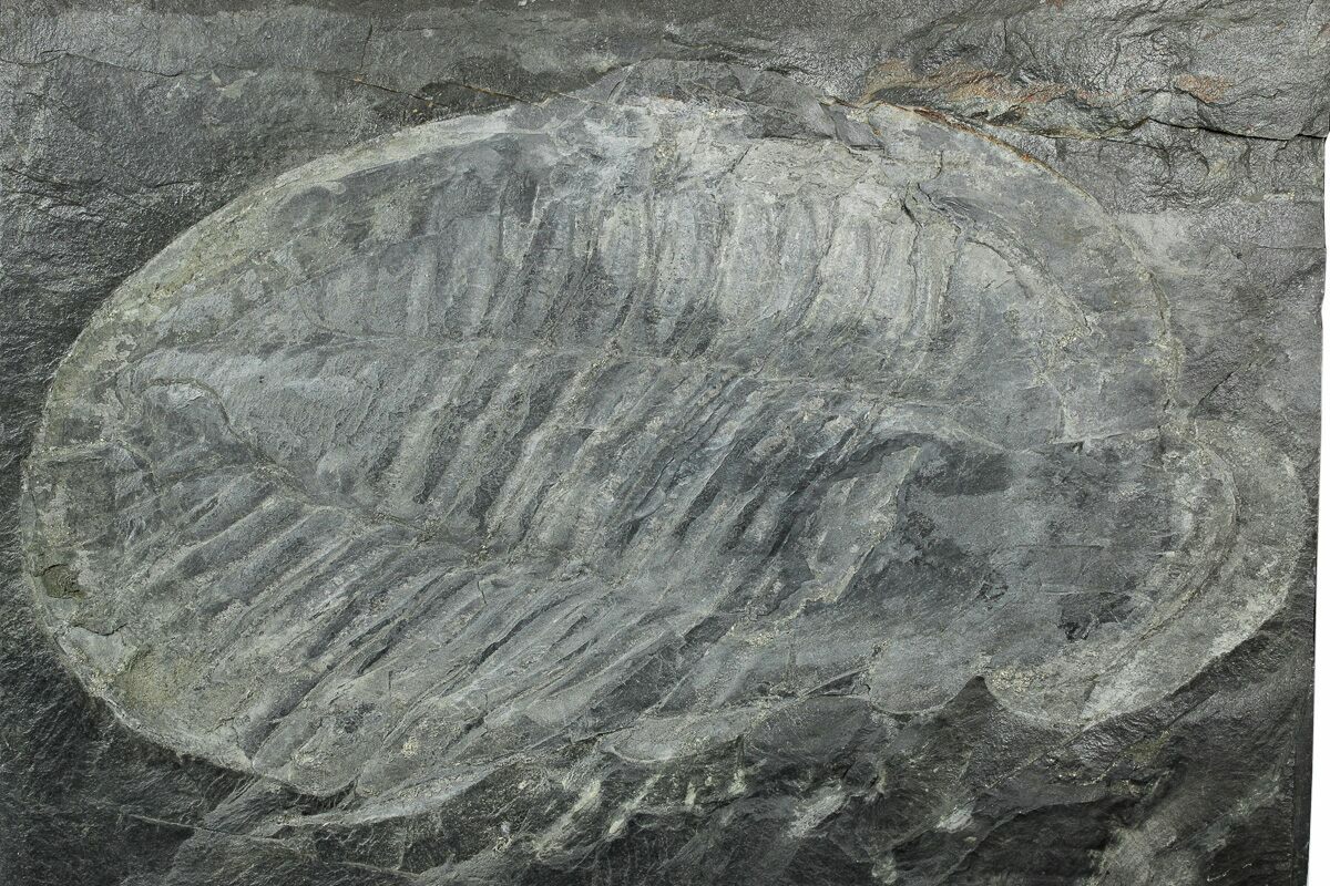 This is a giant, 12.2" long Ogyginus forteyi from Arouca, Portugal. It comes from the Canelas Quarry which has produced a mega-fauna of Middle Ordovician trilobites. The quarry is now a UNESCO geopark, so no no material will be coming onto the market from this location.