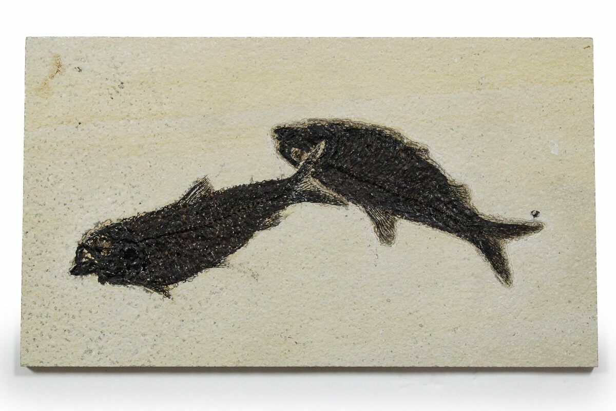 This is a 9.1" wide fossil fish plate collected from the Clear Creek Quarry at the Green River Formation of Wyoming. The shale contains two Knightia eocaena fish that are naturally associated with each other and bear jet-black preservation. They measure 4.5" and 4.4" long.