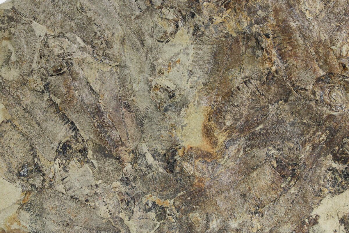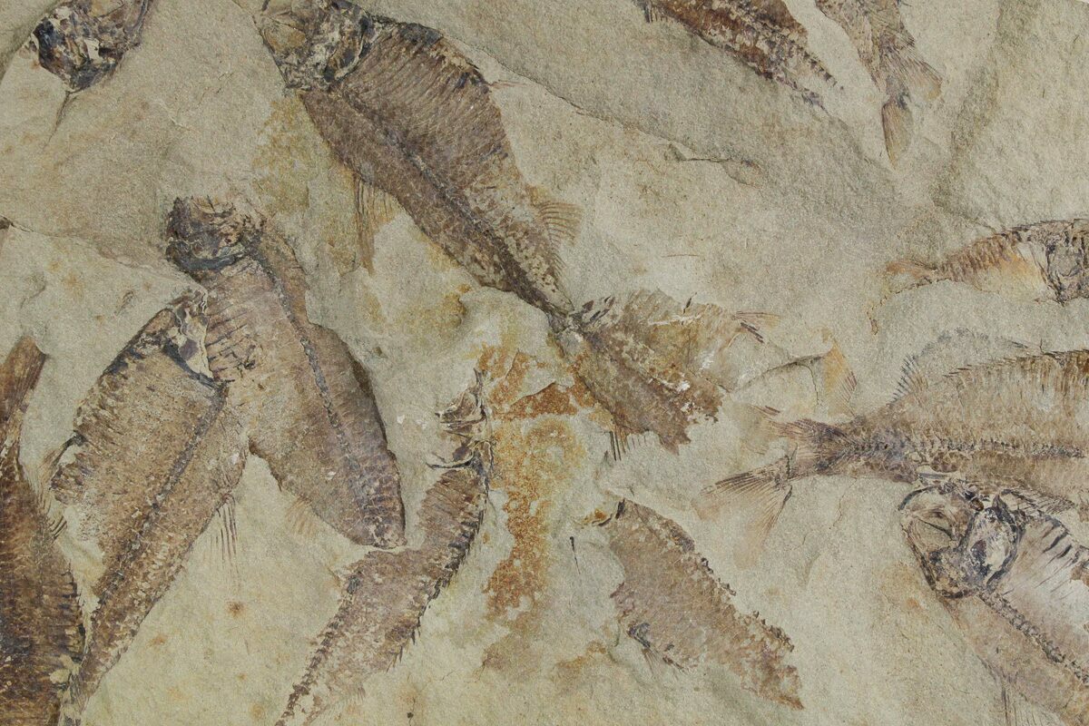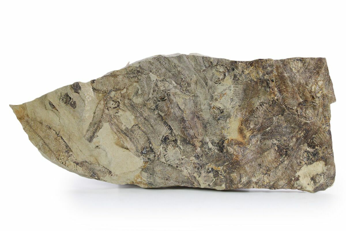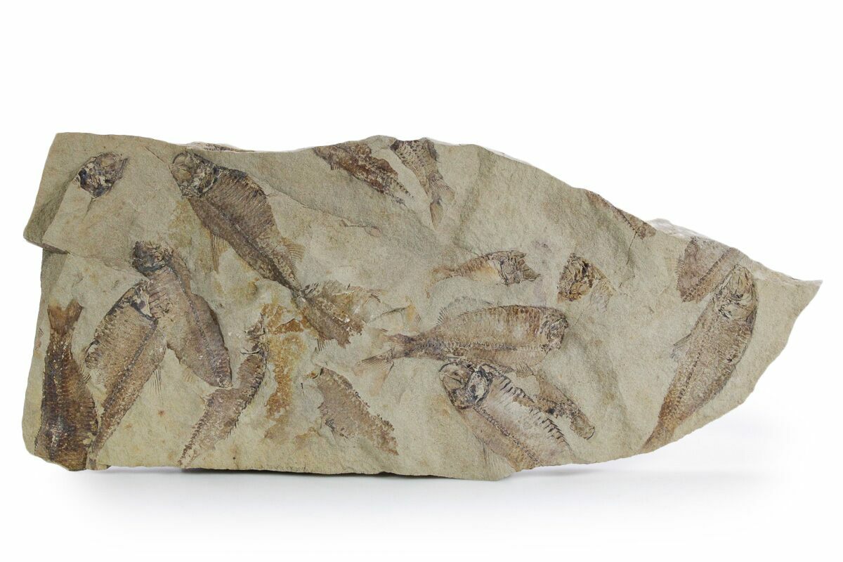 This is a 12.4 x 5.2" mortality plate of detailed fossil herring (Gosiutichthys parvus) from the Green River Formation of Wyoming. It comes from a different location than most of the Green River fish fossils, representing the ancient Lake Gosiute, not Fossil Lake. The preservation is also quite different compared to the fossil fish found in the Fossil Lake deposits, being a course grained mudstone. They are very detailed, with the bony structures, fins, and scales easily seen. Fish can be found on both sides of this plate.