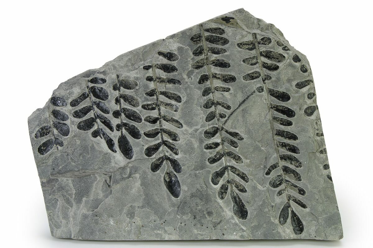 This is a beautiful fossil fern (Neuropteris cordata) from the Late Carboniferous-aged Montceau-les-Mines Lagerstatte of France. This formation is Stephanian Stage in age, or approximately 300 million years old. The longest fern pinna measures 8.3" long and the fossils are laid out nicely on a 12.5 x 9.4" slab of rock.