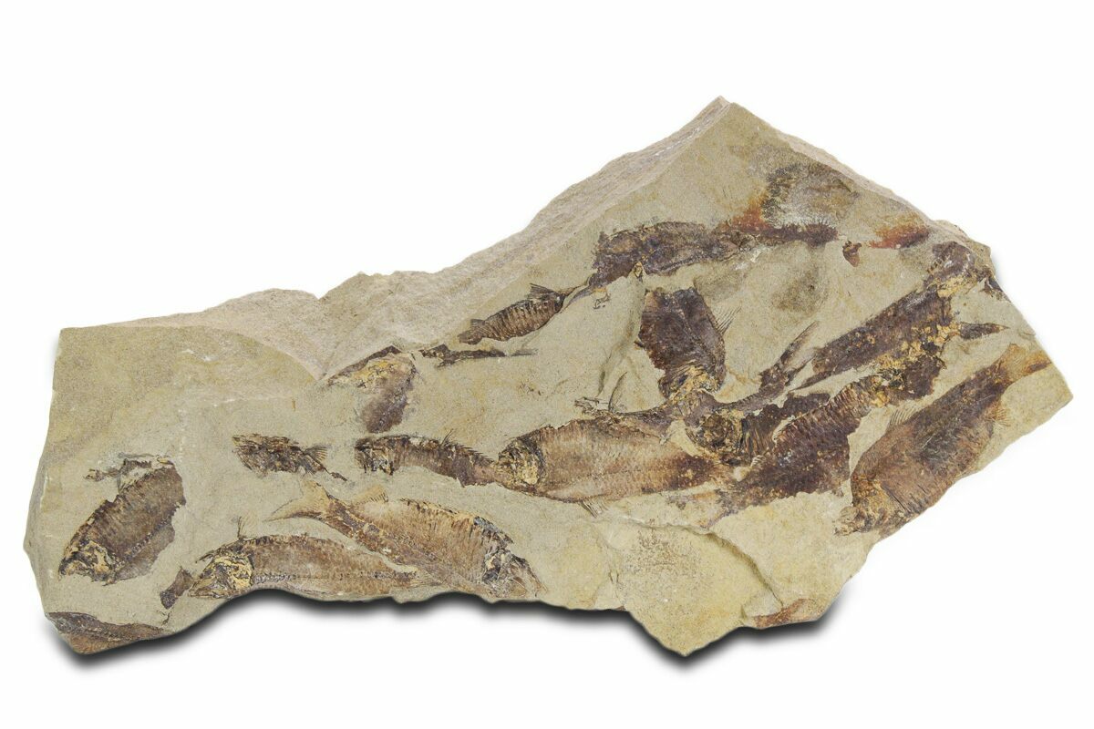 This is a 12.5 x 5.9" mortality plate of detailed fossil herring (Gosiutichthys parvus) from the Green River Formation of Wyoming. It comes from a different location than most of the Green River fish fossils, representing the ancient Lake Gosiute, not Fossil Lake. The preservation is also quite different compared to the fossil fish found in the Fossil Lake deposits, being a course grained mudstone. They are very detailed, with the bony structures, fins, and scales easily seen.