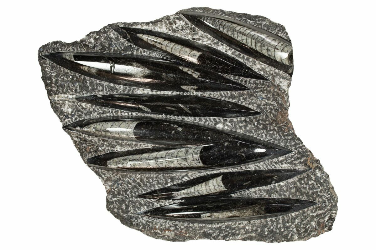 The fossils commonly known as Orthoceras are extinct "straight" cephalopods that lived during the Upper Devonian period around 370 million years ago. Like other cephalopods, they lived inside of their shells, had tentacles they could use to grab food, and used jet propulsion, squirting water to move. The rock containing them is quarried from the Atlas Mountains of Morocco and frequently polished to reveal the fossils and make decorative items with them.