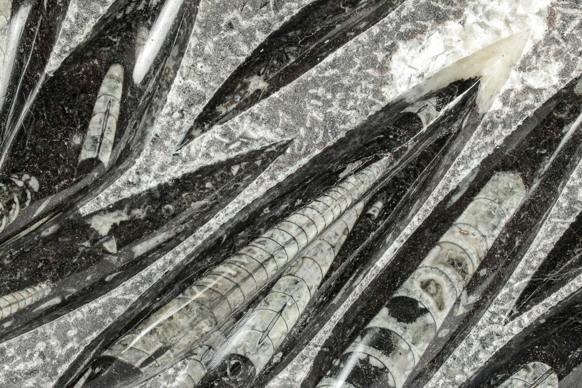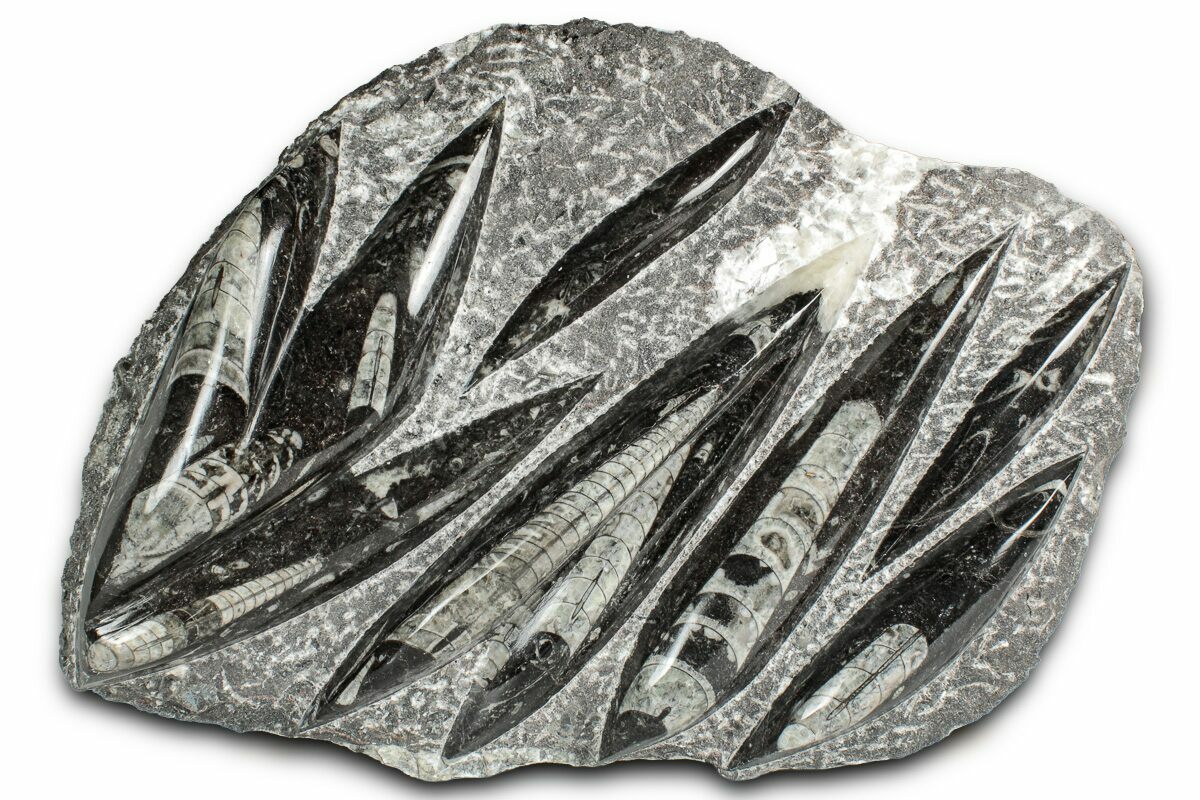 The fossils commonly known as Orthoceras are extinct "straight" cephalopods that lived during the Upper Devonian period around 370 million years ago. Like other cephalopods, they lived inside of their shells, had tentacles they could use to grab food, and used jet propulsion, squirting water to move. The rock containing them is quarried from the Atlas Mountains of Morocco and frequently polished to reveal the fossils and make decorative items with them.
