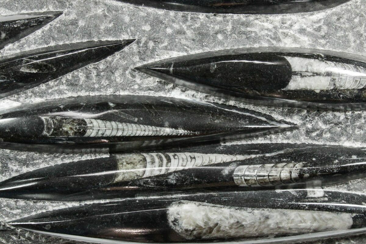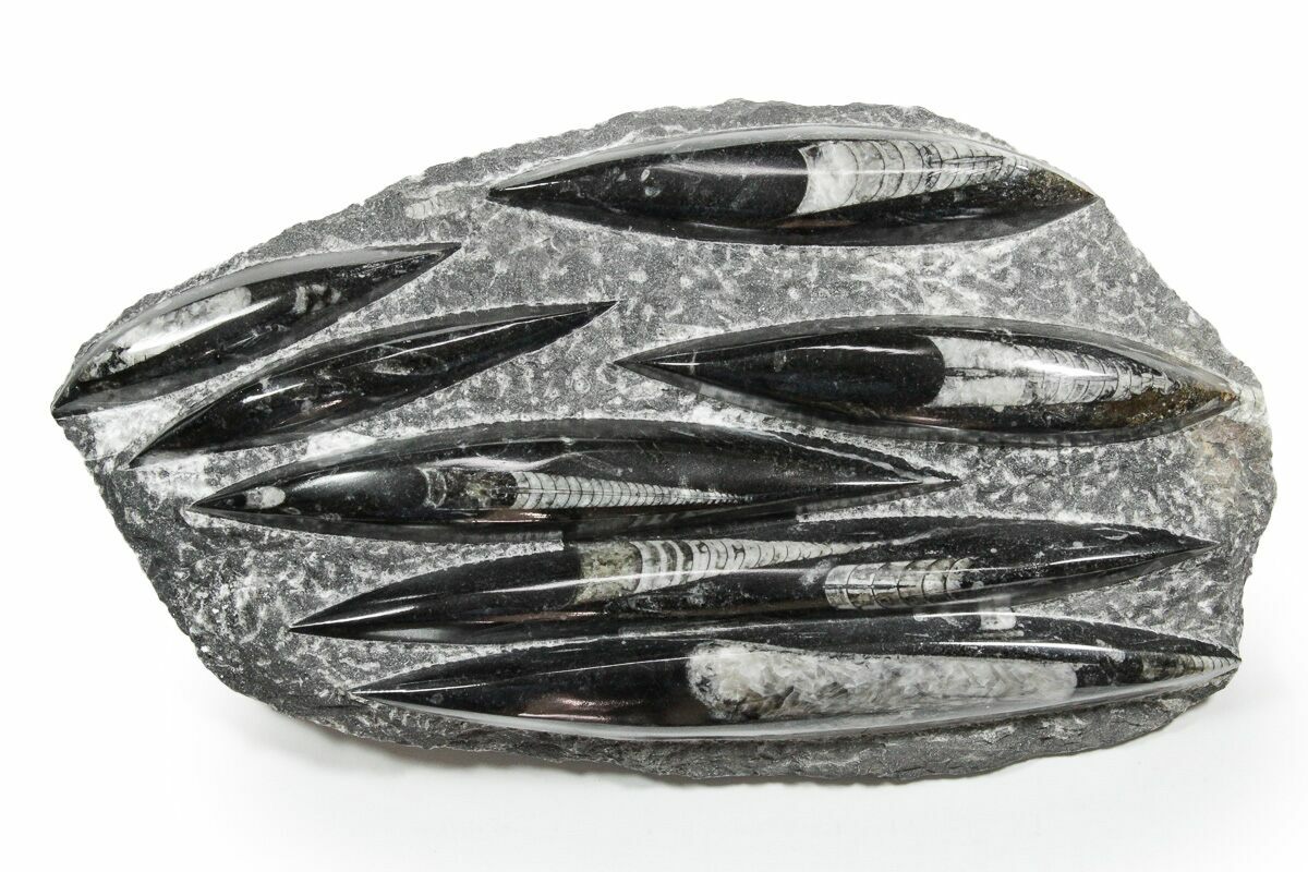 The fossils commonly known as Orthoceras are extinct "straight" cephalopods that lived during the Upper Devonian period around 370 million years ago. Like other cephalopods, they lived inside of their shells, had tentacles they could use to grab food, and used jet propulsion, squirting water to move. The rock containing them is quarried from the Atlas Mountains of Morocco and frequently polished to reveal the fossils and make decorative items with them.