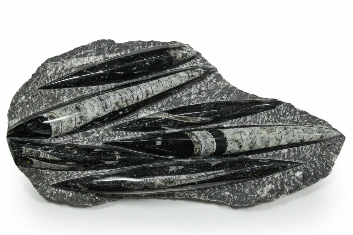 The fossils commonly known as Orthoceras are extinct "straight" cephalopods that lived during the Upper Devonian period around 370 million years ago. Like other cephalopods, they lived inside of their shells, had tentacles they could use to grab food, and used jet propulsion, squirting water to move. The rock containing them is quarried from the Atlas Mountains of Morocco and frequently polished to reveal the fossils and make decorative items with them.