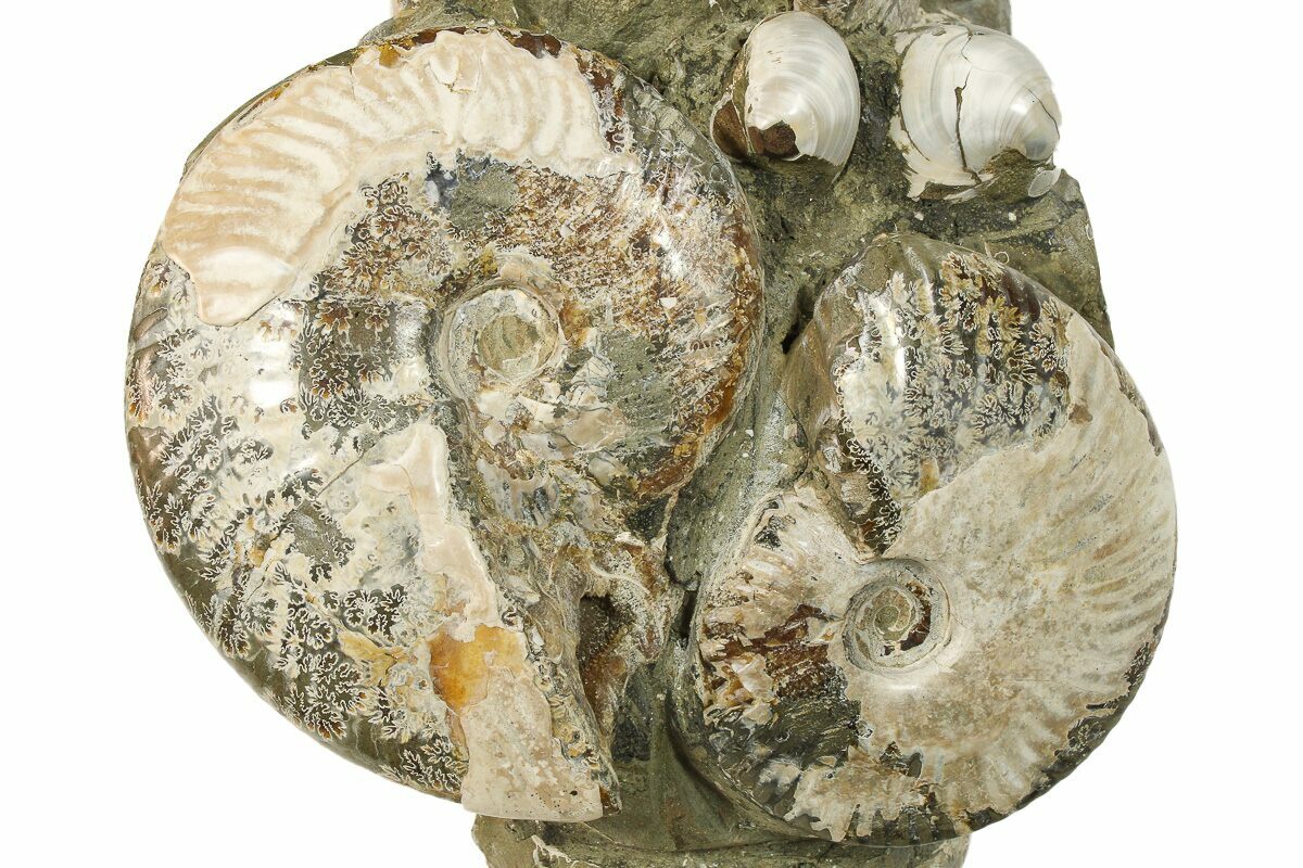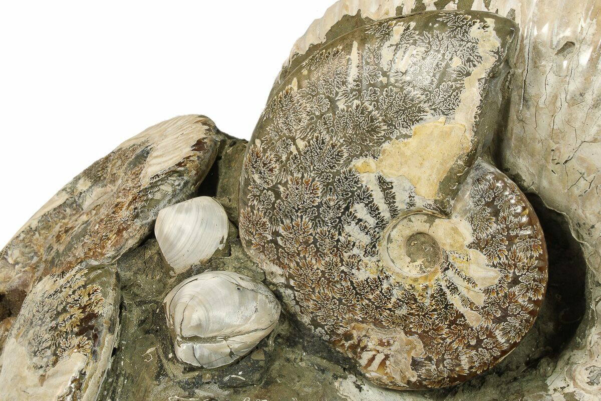 This is a giant, 13.2" wide Douvilleiceras ammonite from the Upper Cretaceous of Madagascar. This genus of ammonites has earned the local name "Tractor Ammonites", due to their distinctively bumpy surface and pronounced ridges that resemble a tractor tire. It weighs a whopping 41 lbs and has several other ammonites and clams that have been composited onto the specimen. The ammonites are of the genus Cleoniceras and the clams are from the genus Astarte.