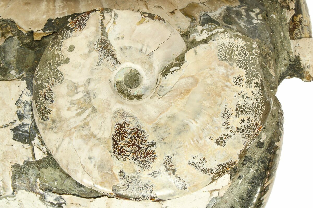 Portions of the ammonite have undergone pyrite replacement. These nodule-like pyrite formations have been polished and can be found scattered around the shell.