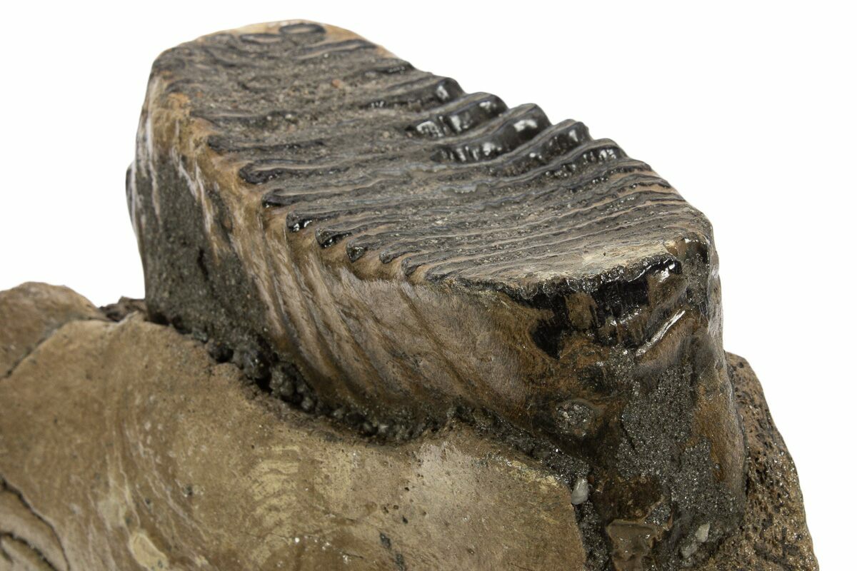 This beautiful fossil is a partial jaw from a near adult woolly mammoth (Mammuthus primigenius). It was collected from the Rhine River of Germany and is between 20 and 50 thousand years old. This amazing example is the right half of the mandible (lower jaw) with an M2 molar locked in position. The tooth shows feeding wear and the prisms (hard enamel structures), dentine, and cementum are in very good condition. The medial side of the bone is missing, showing off the roots.