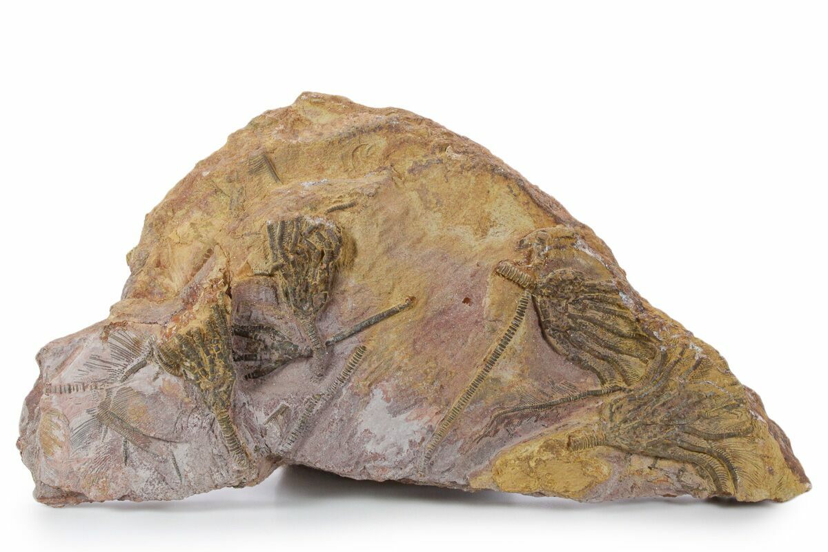 This is a 12.2" wide plate of four Lower Ordovician crinoid fossils collected near Marzane, Morocco. They're located on a nice solid slab of limestone.