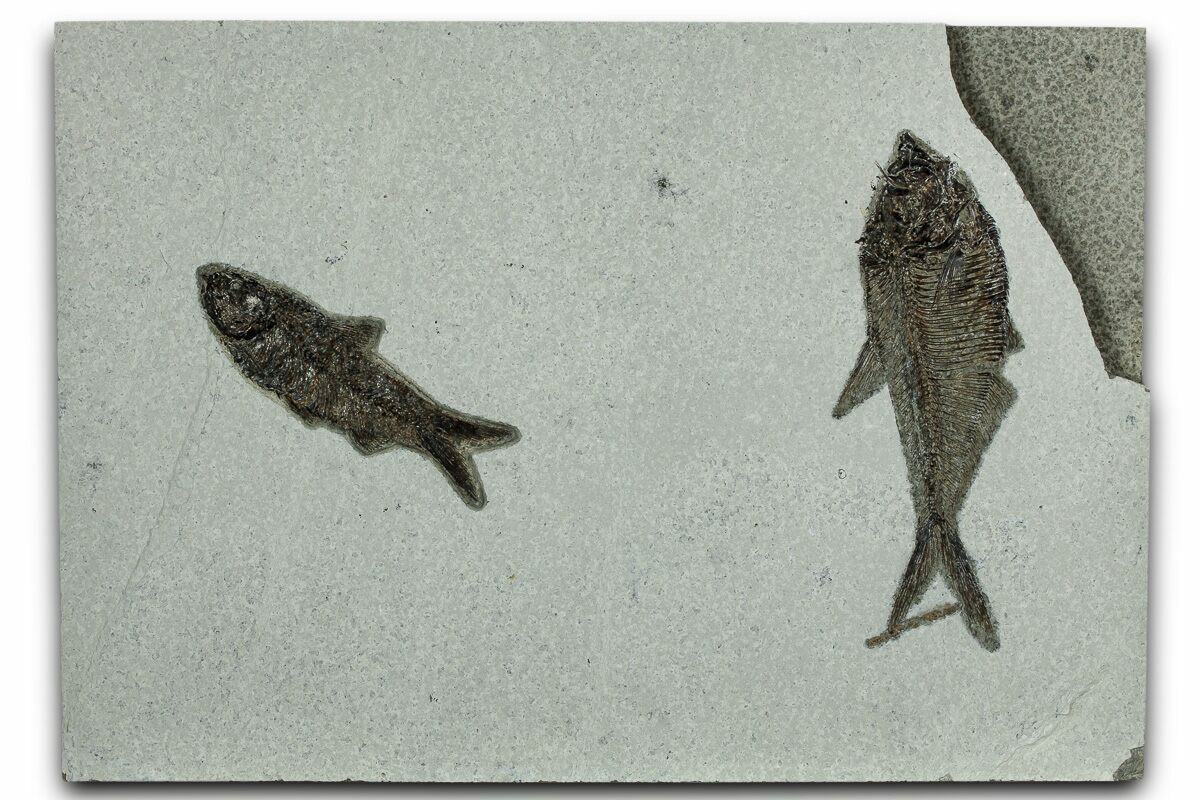 This is a 13.7" wide fossil fish plate collected from the Clear Creek Quarry at the Green River Formation of Wyoming. The shale contains two fish (Diplomystus dentatus and Knightia eocaena) that are naturally associated with each other. They come out of the 18 inch layer (bottom cap) which produces beautifully preserved fish, but takes 2-3x longer to prep. The Diplomystus is 6.3" long and the Knightia measures 4.4" long.