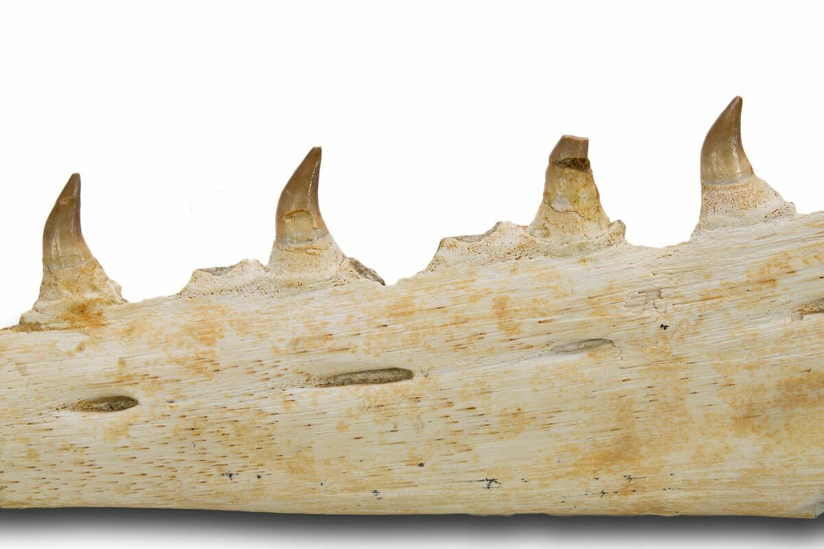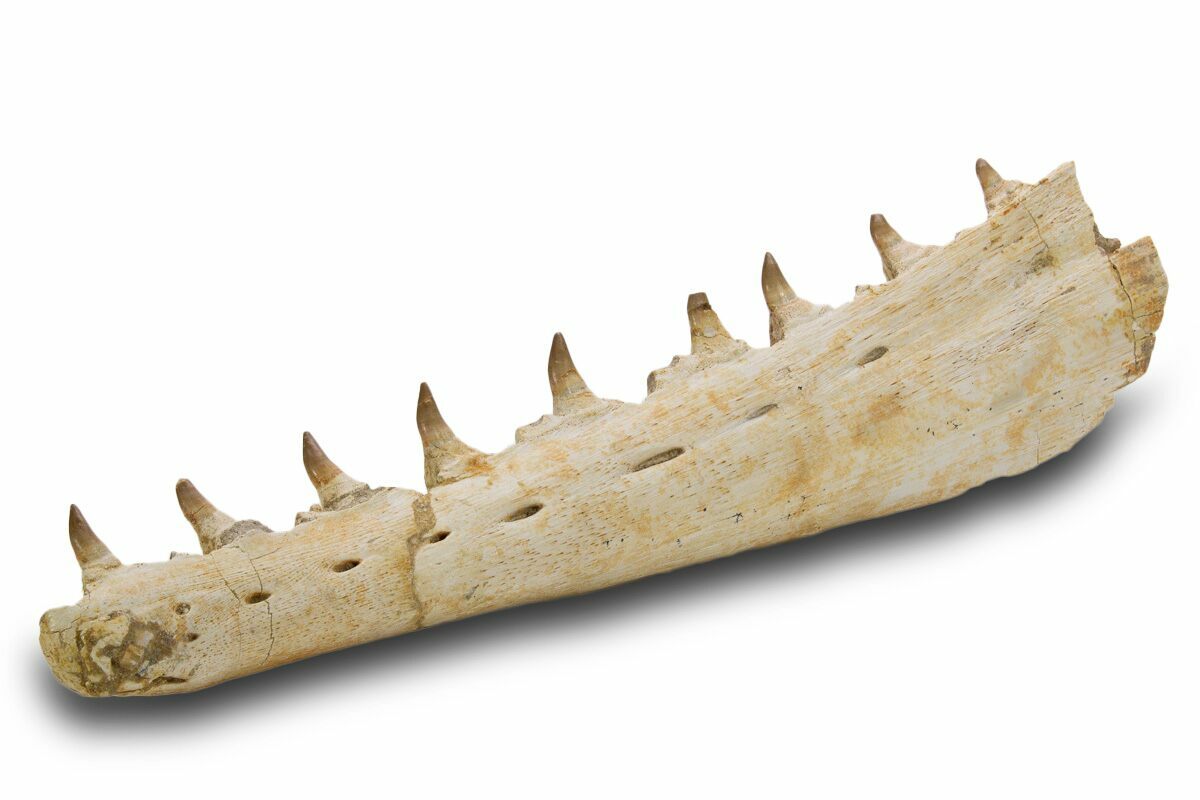 This is a 13.8" long fossil jaw section of a mosasaur from the Phosphate Deposits near Khouribga, Morocco. It is a portion of the mandible (lower jaw) from the left side of the skull. The specimen shows off the foramen and contains nine teeth still attached to the jaw. There are almost a dozen mosasaurs described from these deposits, but based on the teeth it is most likely from the species Pluridens serpentis.