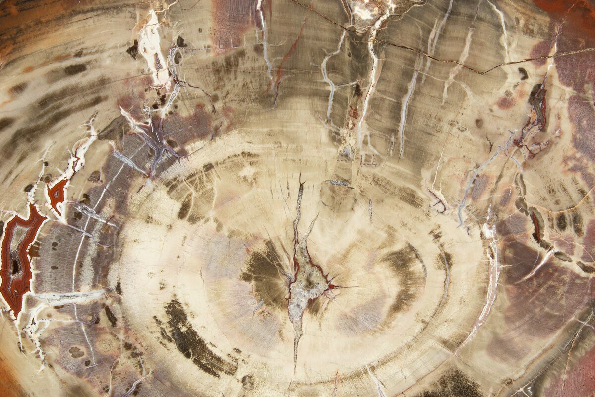 Petrified wood is the name given to wood that has been turned into stone (fossilized) through the process of permineralization. In this process, all of the organic matter becomes replaced by minerals, while much of the original structure, such as tree rings, is retained. For this to happen, the wood needs to be buried in an environment low in oxygen to prevent decomposition and with flowing, mineral-laden water, so minerals may replace structures. The coloration is caused by various minerals/impurities present in the water during fossilization. For example, red colors in many cases can be attributed to iron compounds, greens due to copper, and so on.