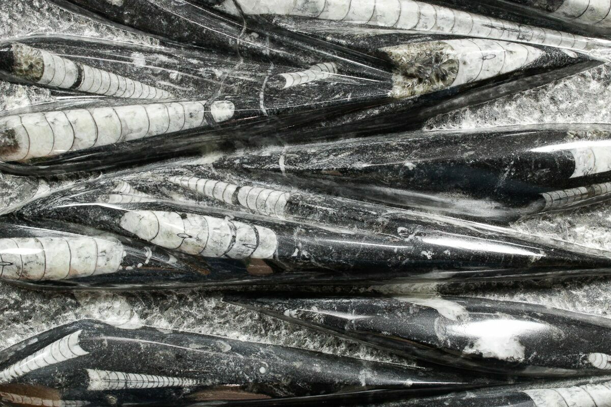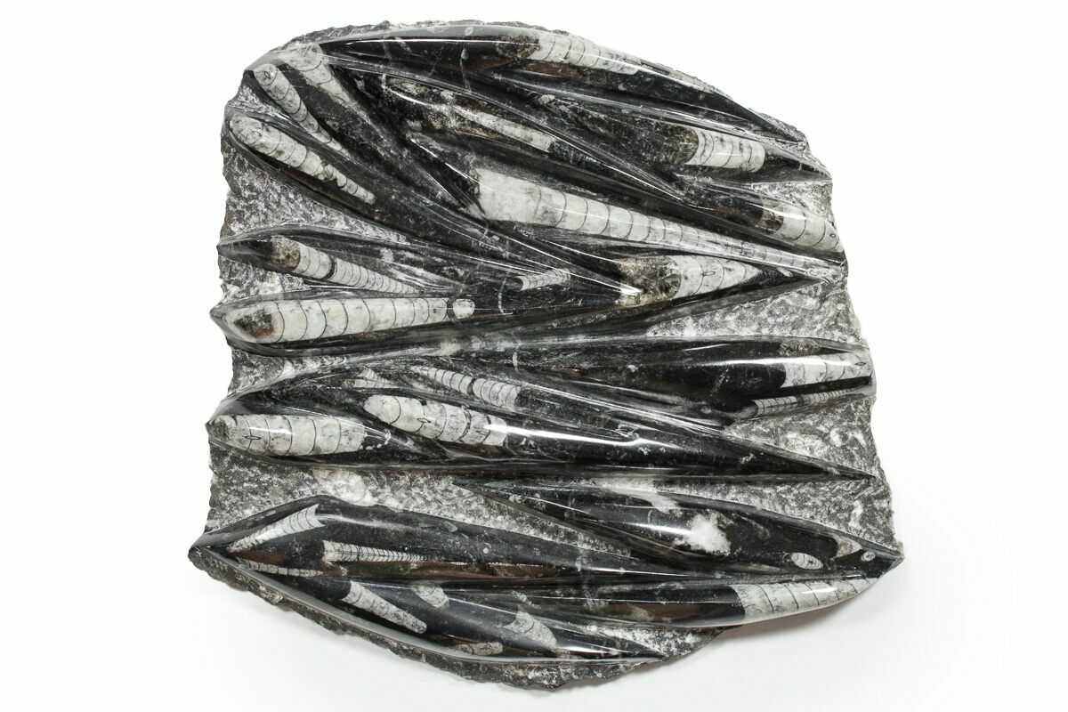 The fossils commonly known as Orthoceras are extinct "straight" cephalopods that lived during the Upper Devonian period around 370 million years ago. Like other cephalopods, they lived inside of their shells, had tentacles they could use to grab food, and used jet propulsion, squirting water to move. The rock containing them is quarried from the Atlas Mountains of Morocco and frequently polished to reveal the fossils and make decorative items with them.