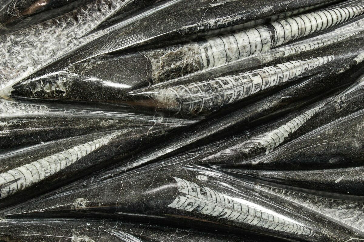 The fossils commonly known as Orthoceras are extinct "straight" cephalopods that lived during the Upper Devonian period around 370 million years ago. Like other cephalopods, they lived inside of their shells, had tentacles they could use to grab food, and used jet propulsion, squirting water to move. The rock containing them is quarried from the Atlas Mountains of Morocco and frequently polished to reveal the fossils and make decorative items with them.