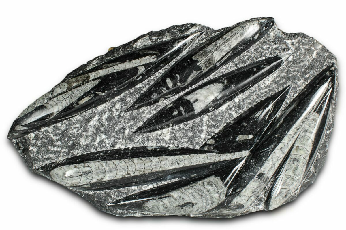 The fossils commonly known as Orthoceras are extinct "straight" cephalopods that lived during the Upper Devonian period around 370 million years ago. Like other cephalopods, they lived inside of their shells, had tentacles they could use to grab food, and used jet propulsion, squirting water to move. The rock containing them is quarried from the Atlas Mountains of Morocco and frequently polished to reveal the fossils and make decorative items with them.