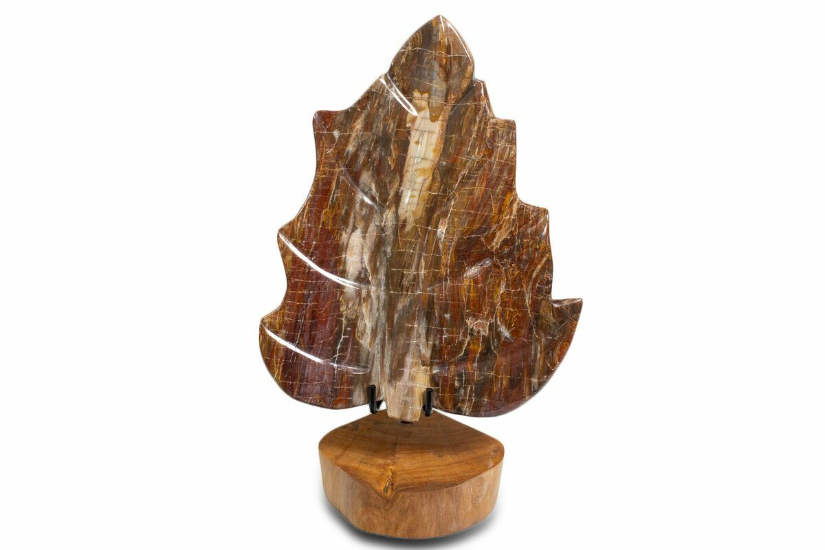 This is a beautiful hand polished leaf made from colorful Triassic-aged petrified wood (Araucaria) collected in Ambilobe, Madagascar. The specimen measures 13" long and has been sculpted into the shape of a leaf. It sits upright nicely on the accompanied metal and wood display stand.