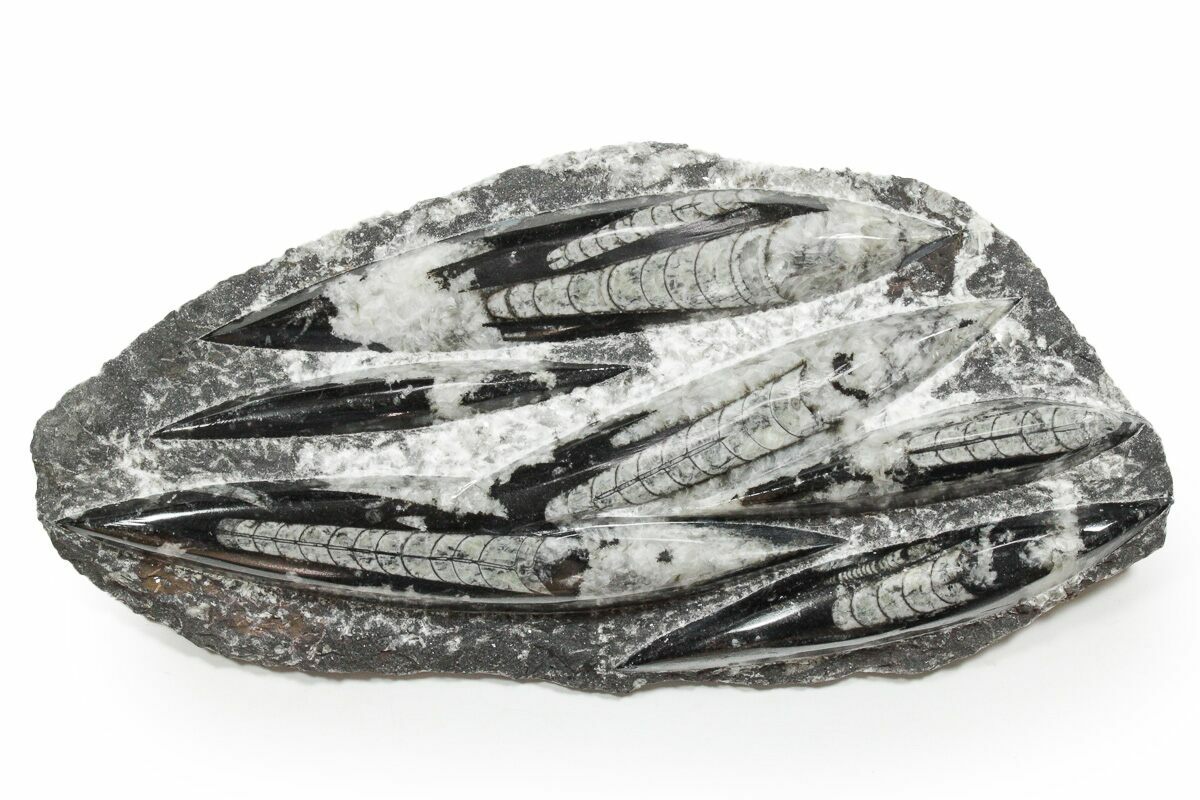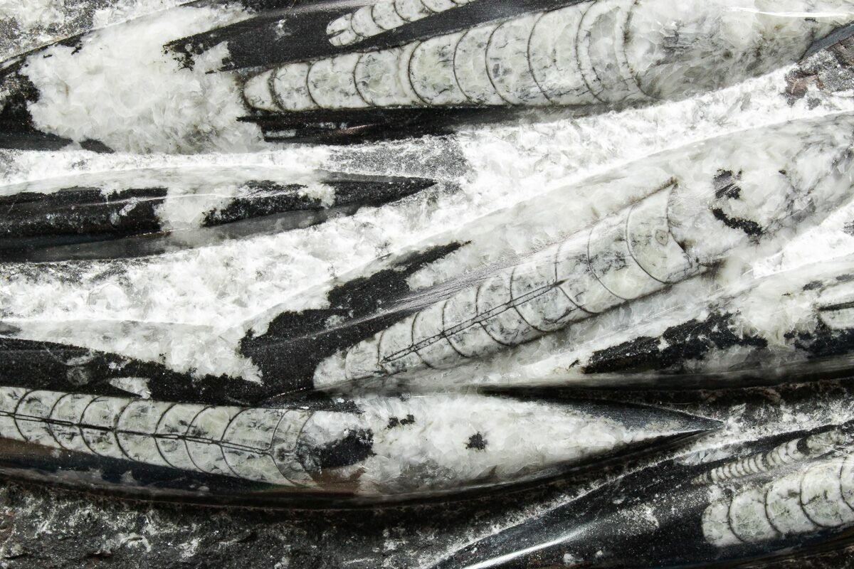 The fossils commonly known as Orthoceras are extinct "straight" cephalopods that lived during the Upper Devonian period around 370 million years ago. Like other cephalopods, they lived inside of their shells, had tentacles they could use to grab food, and used jet propulsion, squirting water to move. The rock containing them is quarried from the Atlas Mountains of Morocco and frequently polished to reveal the fossils and make decorative items with them.