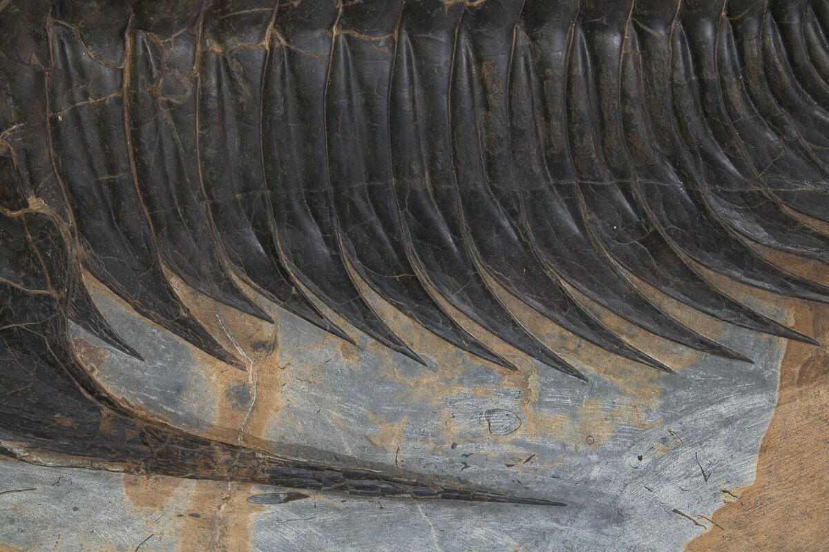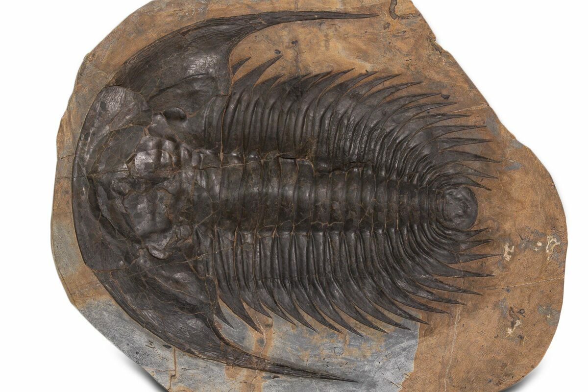 A recently discovered locality, however, has produced a very limited number of Acadoparadoxides with exceptional preservation. These rare examples exhibit a rich, dark brown shell rather than the typical orange “rusted” appearance. This 14.3" specimen is the first we’ve acquired from this remarkable site, and future availability is uncertain. The preservation is superb, with only a few repaired cracks and virtually no restoration—a truly striking example of this classic trilobite.