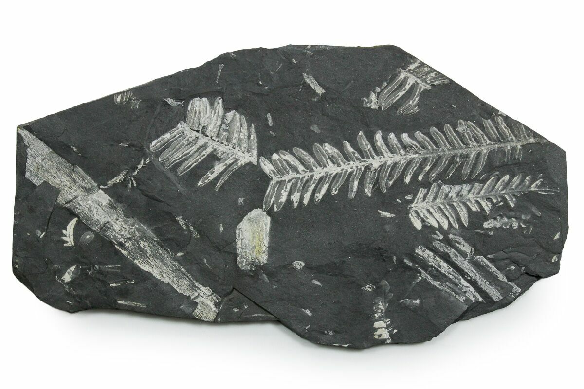 This is a 14.6" wide plate of fossil seed ferns from the Pennsylvanian aged (305 million year) Llewellyn formation of Pennsylvania. The white color of these detailed fern fossils contrasts well against the black shale they are preserved in. These St. Clair fern plates used to be quite common but access to the locality is now restricted so there is not a lot of material left on the market.