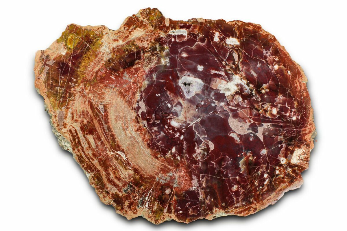The petrified wood from Araucarioxylon arizonicum happens to be the state fossil of Arizona. It is frequently referred to as "rainbow wood" because of the large variety of colors some specimens exhibit. The reds and oranges come from hematite inclusions within the silica, the yellows from limonite, and the purples from extremely fine hematite spherules.