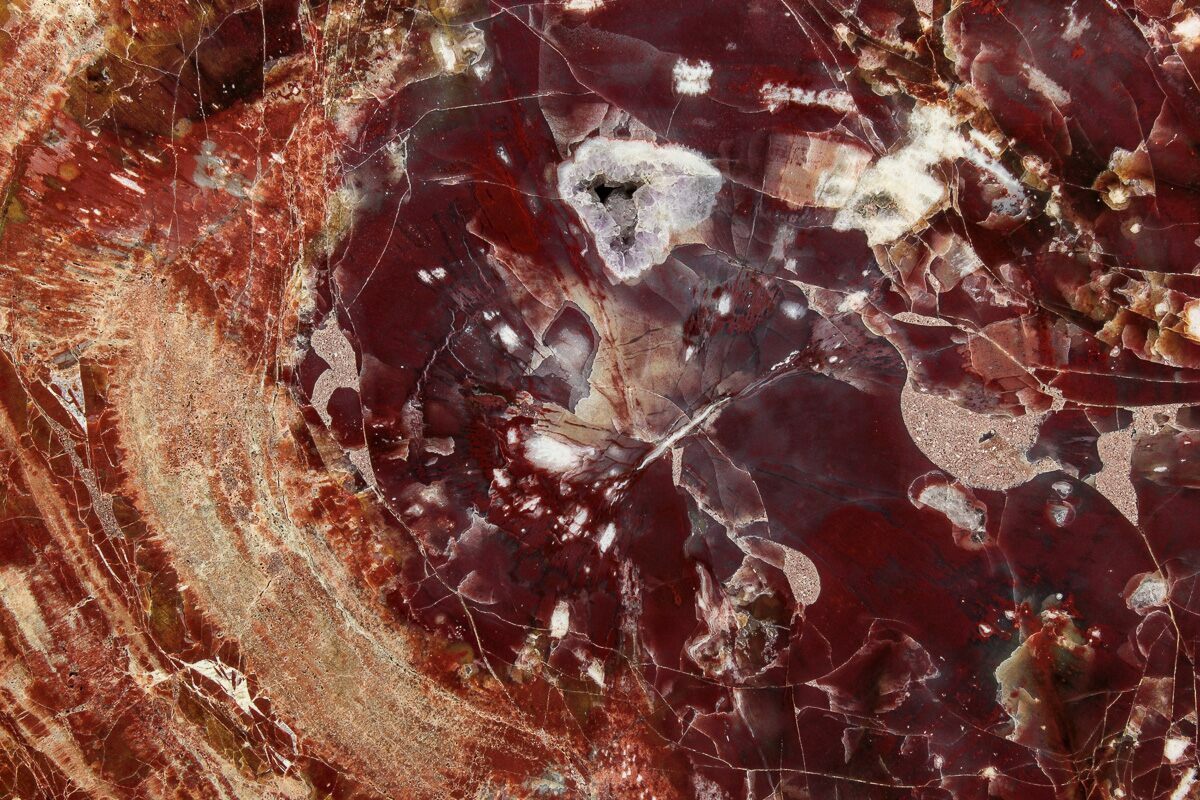 This is a vibrantly colored, 14.7" wide, polished round of petrified wood (Araucarioxylon arizonicum) from Arizona. One side has been highly polished to a glossy-finish. It has a wonderful mixture of brick-red, purple, and white coloration, with an amethyst crystal encrusted pocket near its center. Pictures truly don't do this specimen justice!