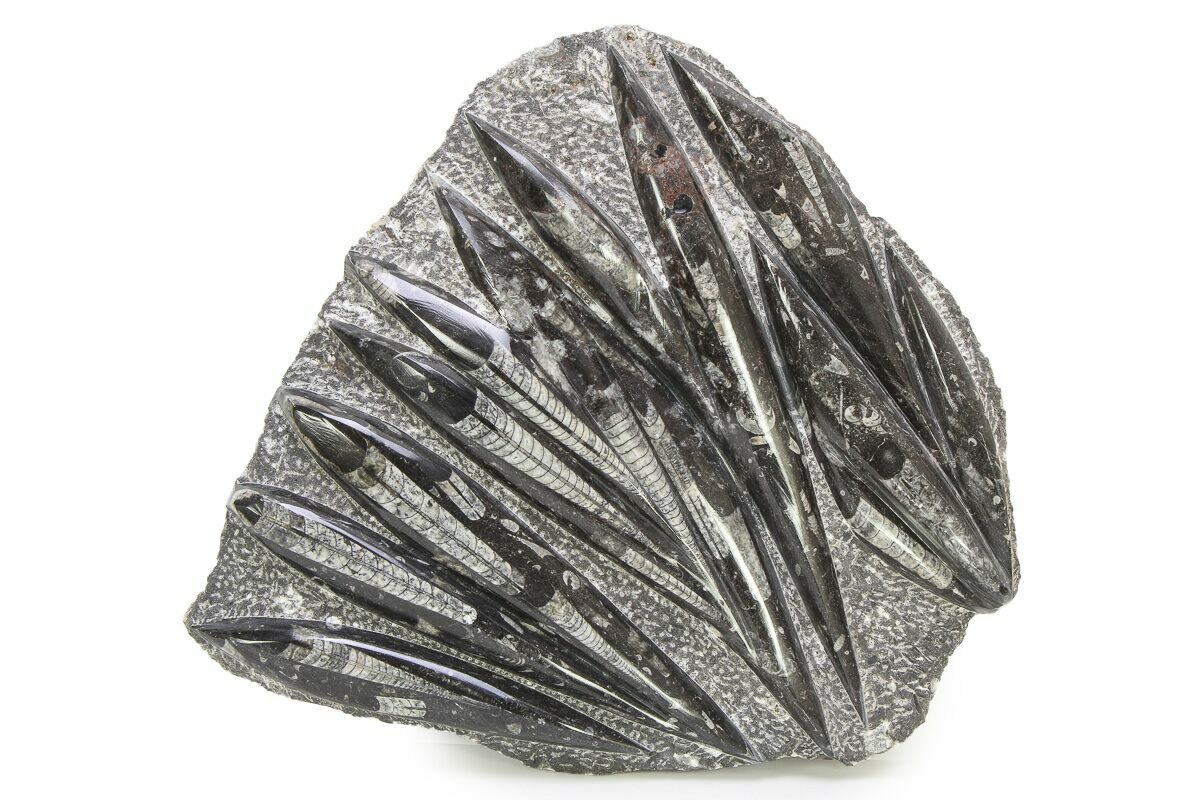 The fossils commonly known as Orthoceras are extinct "straight" cephalopods that lived during the Upper Devonian period around 370 million years ago. Like other cephalopods, they lived inside of their shells, had tentacles they could use to grab food, and used jet propulsion, squirting water to move. The rock containing them is quarried from the Atlas Mountains of Morocco and frequently polished to reveal the fossils and make decorative items with them.