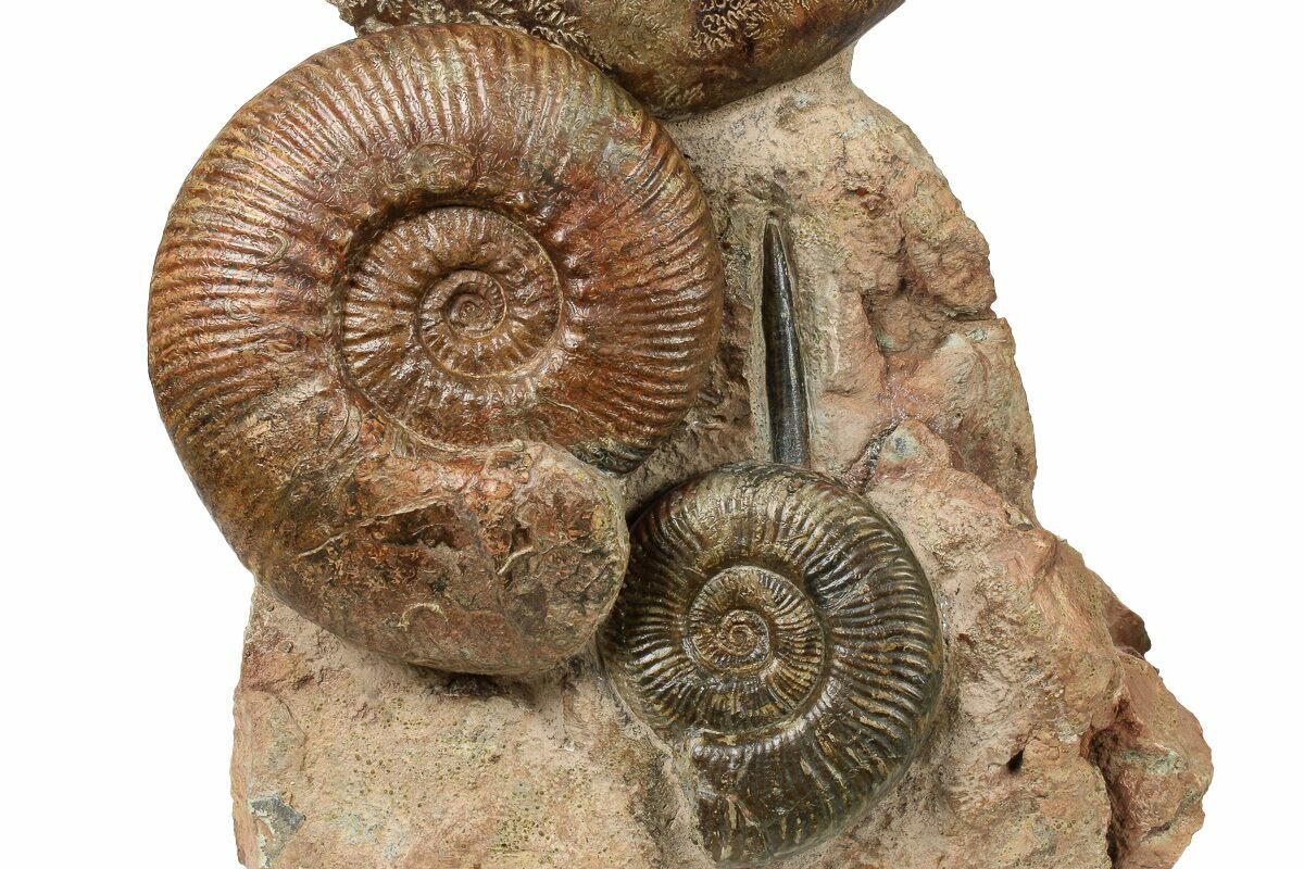 These ammonites were quarried in the Rhône-Alpes region of France and are Lower Jurassic in age, approximately 180 million years old. The sculpture is a composite, meaning that while the fossils are all real, some of them have been mounted on the rock. All of the ammonite fossils have some degree of restoration work.