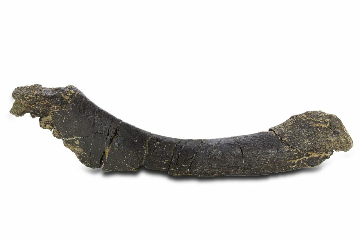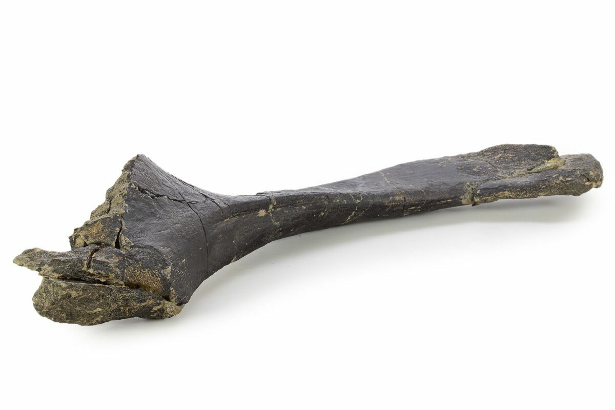 This is a 15.4" long fossil sauropod dinosaur (Camarasaurus sp.) pelvic bone (ischium), collected from the Late Jurassic-aged Morrison Formation in Colorado. Beautiful three-dimensional preservation on this bone with very little crushing.