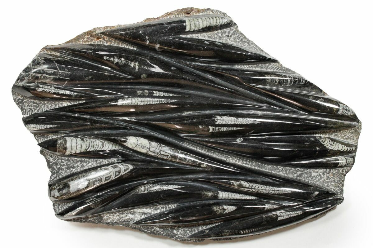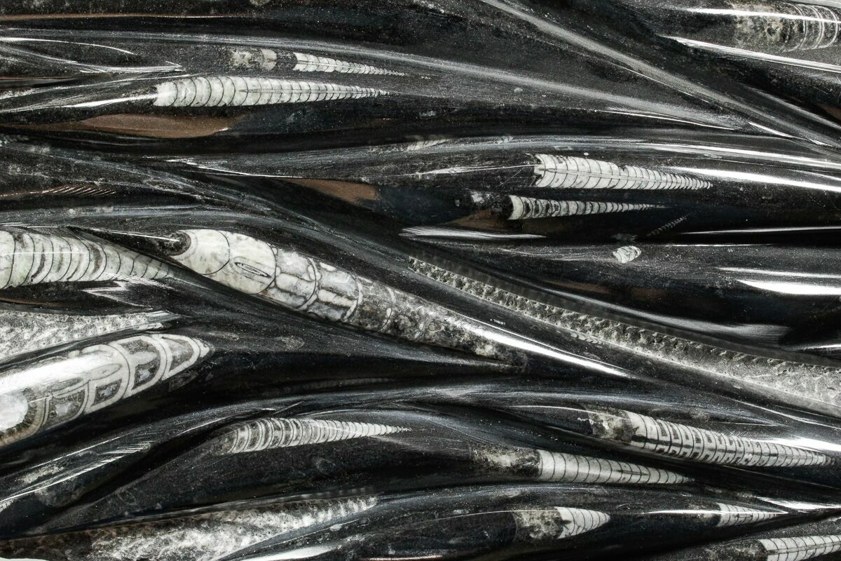 The fossils commonly known as Orthoceras are extinct "straight" cephalopods that lived during the Upper Devonian period around 370 million years ago. Like other cephalopods, they lived inside of their shells, had tentacles they could use to grab food, and used jet propulsion, squirting water to move. The rock containing them is quarried from the Atlas Mountains of Morocco and frequently polished to reveal the fossils and make decorative items with them.