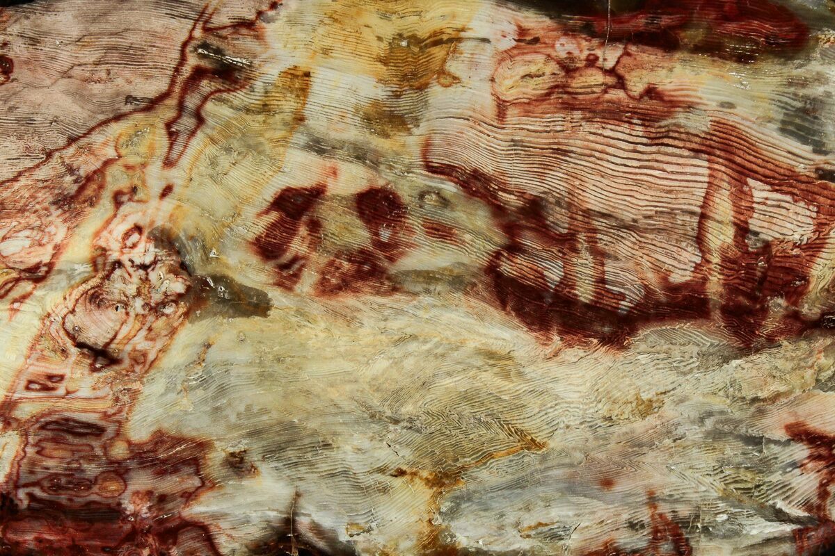 Petrified wood is the name given to wood that has been turned into stone (fossilized) through the process of permineralization. In this process, all of the organic matter becomes replaced by minerals, while much of the original structure, such as tree rings, is retained. For this to happen, the wood needs to be buried in an environment low in oxygen to prevent decomposition and with flowing, mineral-laden water, so minerals may replace structures. The coloration is caused by various minerals/impurities present in the water during fossilization. For example, red colors in many cases can be attributed to iron compounds, greens due to copper, and so on.