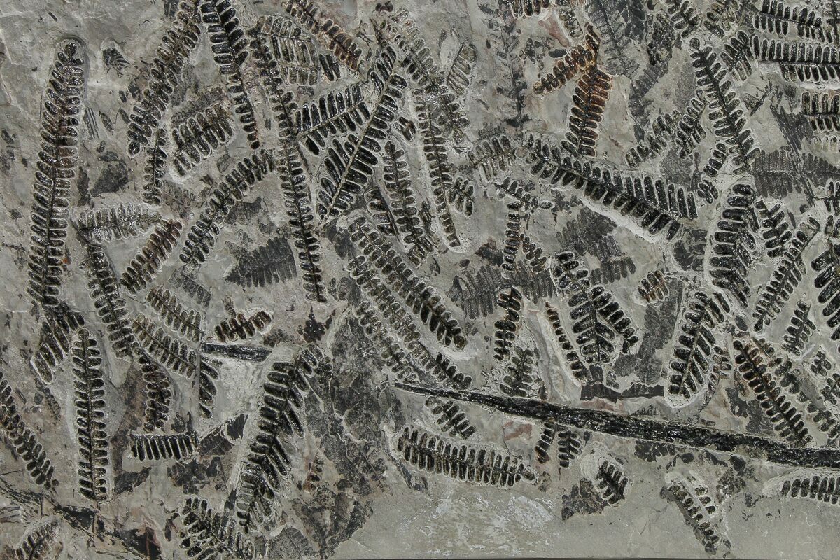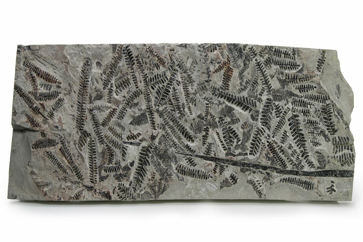This is a fascinating fossil fern (Pecopteris hemireliodes) frond plate from the Late Carboniferous-aged Montceau-les-Mines Lagerstatte of France. This formation is Stephanian Stage in age, or approximately 300 million years old. The ferns are scattered about a rectangular-cut, 16.9 x 7.8", thick slab of rock. A truly breathtaking fossil fern plate!