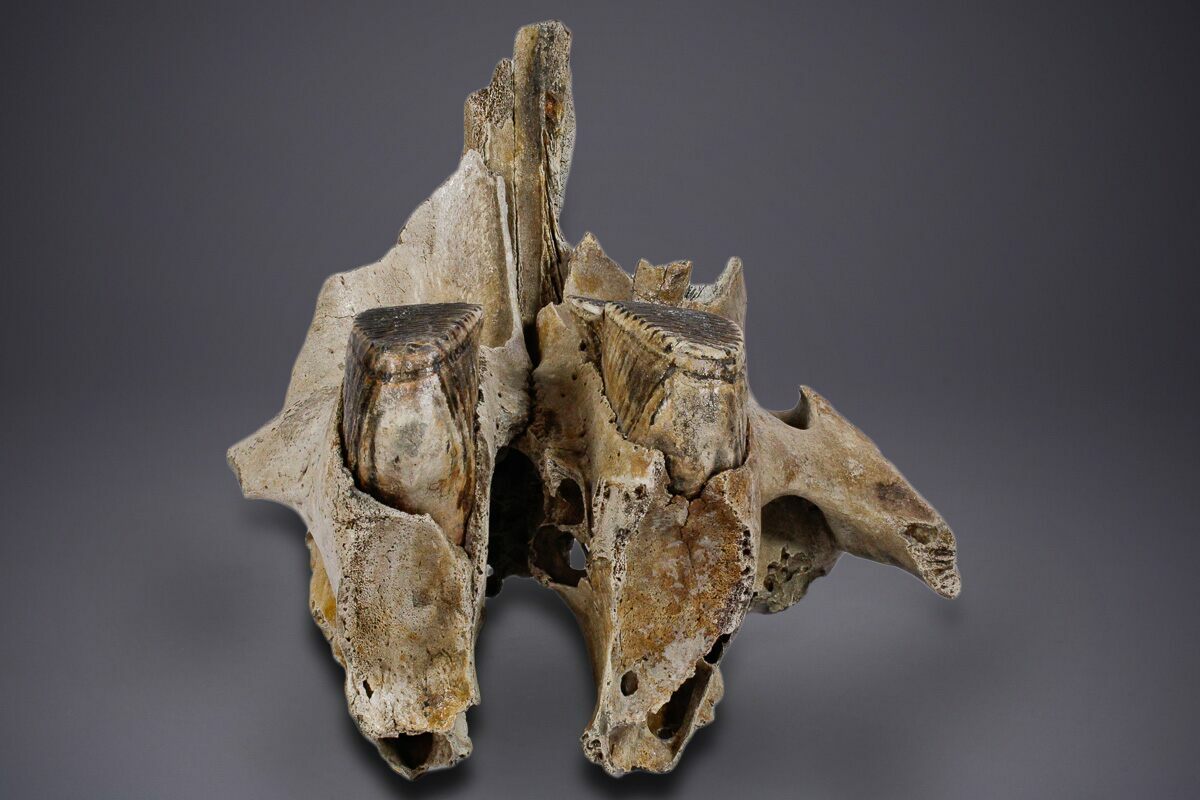 The teeth show wear from feeding and the prisms (hard enamel structures), dentine, and cementum are all visible. The two halves of the maxilla were found separated from each other and have been glued back together. The base of the M1 molar has also been stabilized.