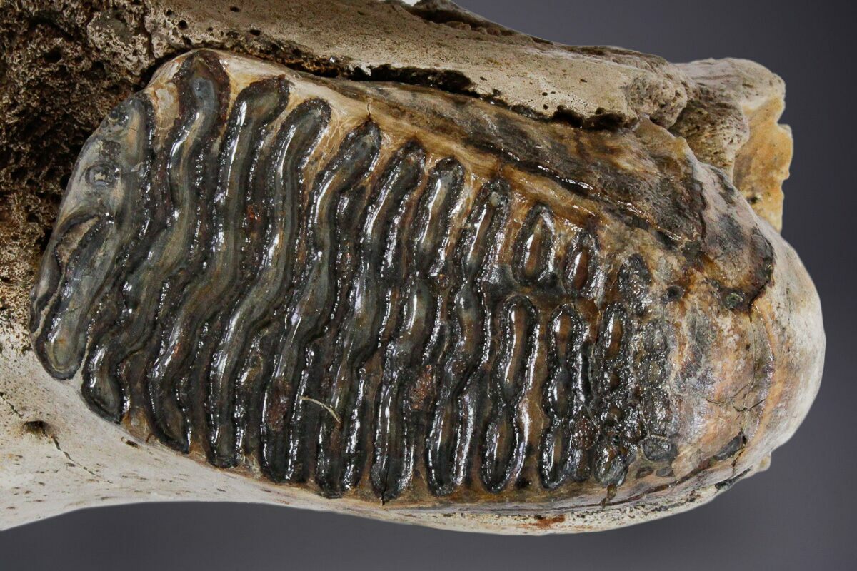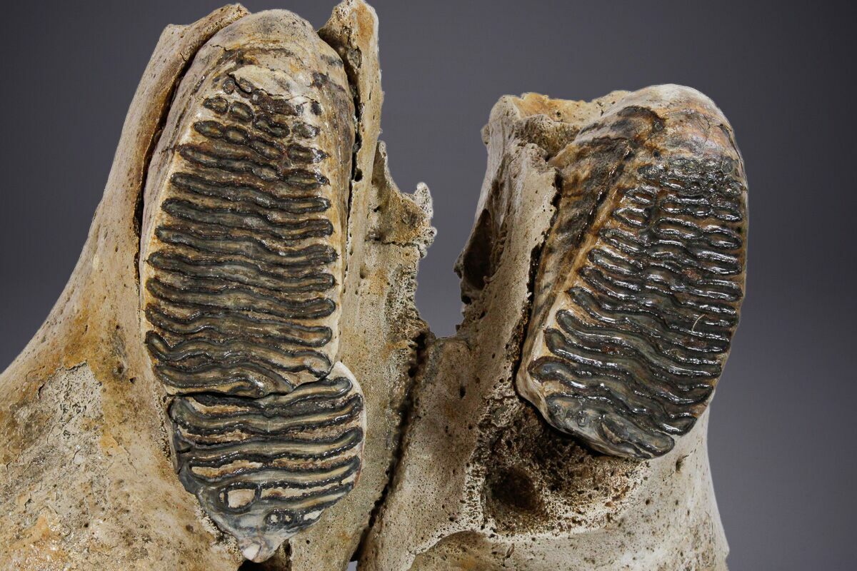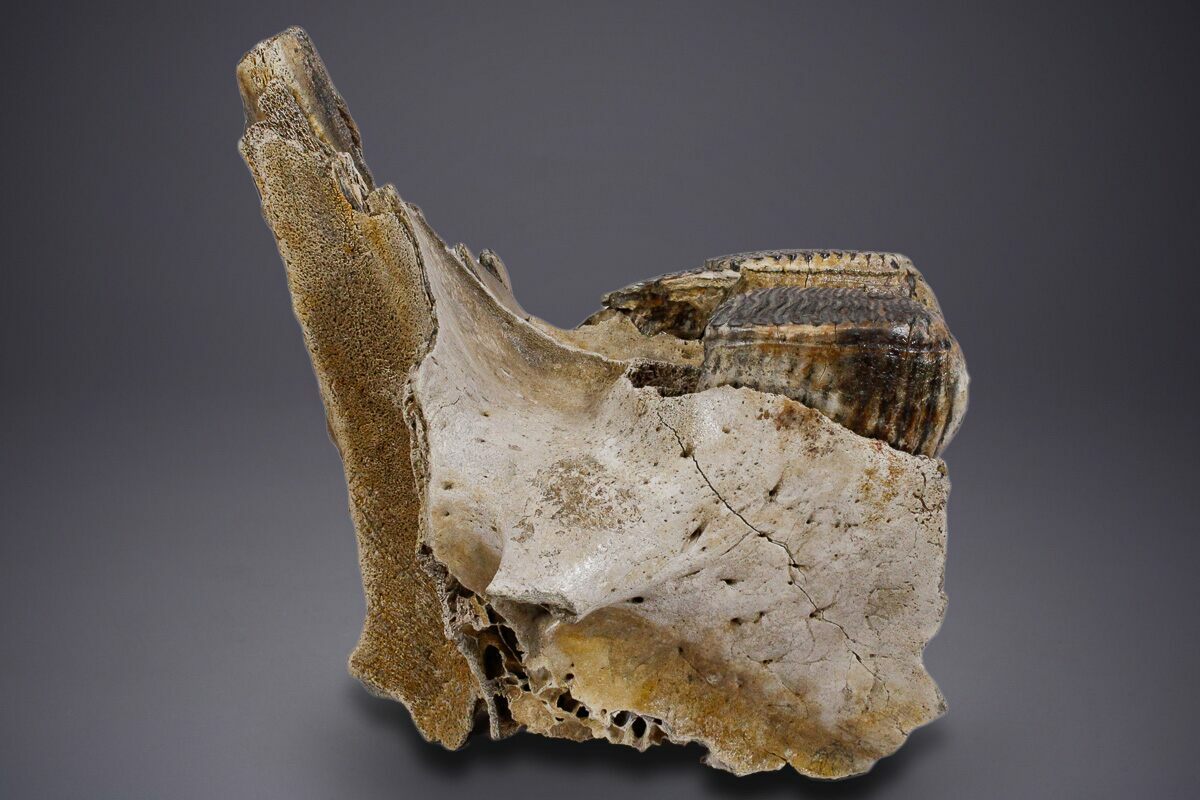 This astounding fossil is a partial upper jaw and skull section of a woolly mammoth (Mammuthus primegenius) from the North Sea Deposits, and is between 20 and 50 thousand years old. This amazing example is the maxilla (upper jaw) with M2 molars locked in position, along with an M1 molar that was on its way out. Another cool feature of this skull section are two partial canals that would have housed the animal's enormous tusks!