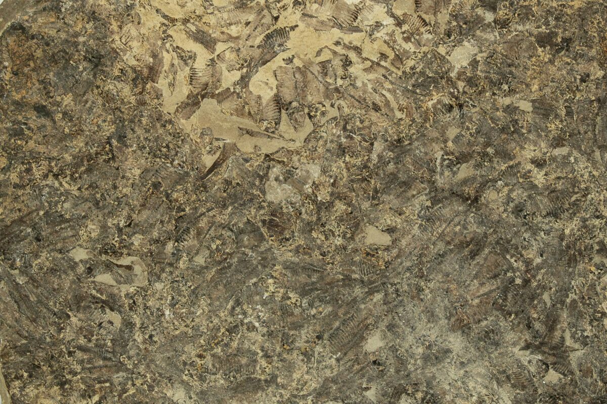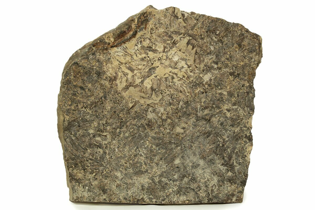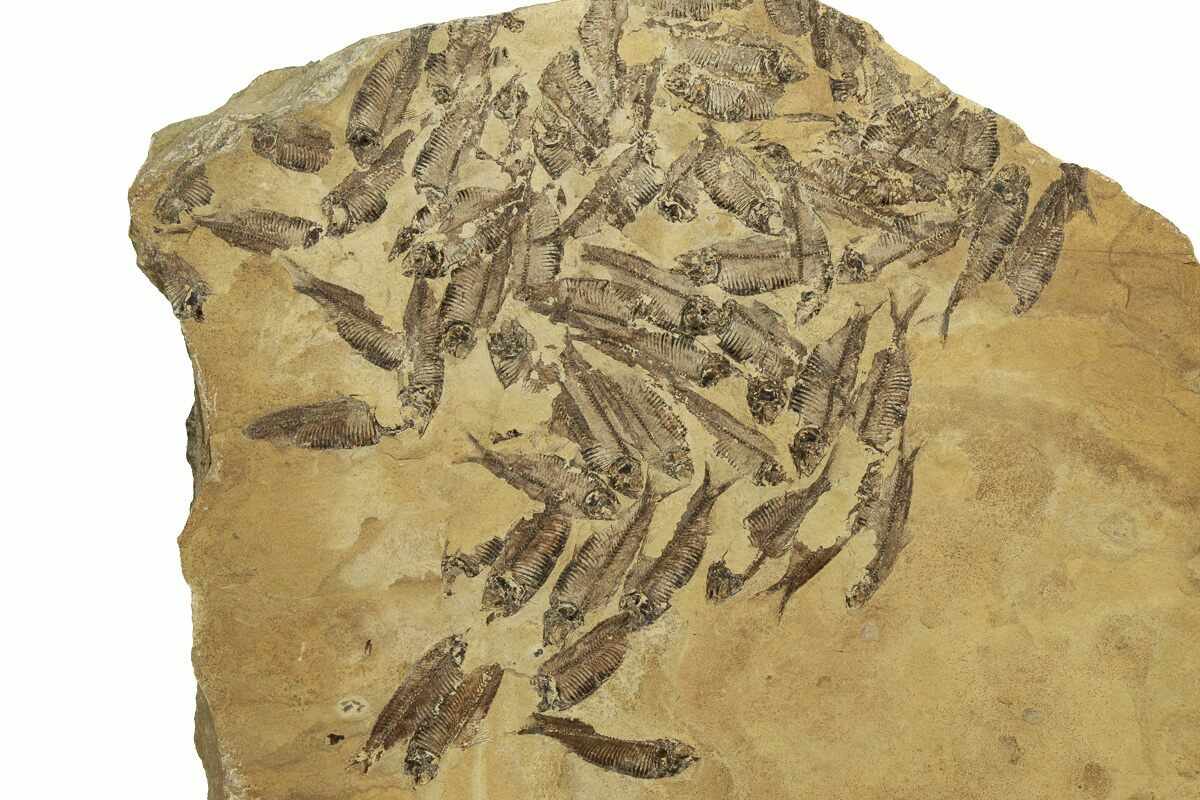 This is a 19 x 18.7" mass mortality plate of detailed fossil herring (Gosiutichthys parvus) from the Green River Formation of Wyoming. It comes from a different location than most of the Green River fish fossils, representing the ancient Lake Gosiute, not Fossil Lake. The preservation is also quite different compared to the fossil fish found in the Fossil Lake deposits, being a course grained mudstone. They are very detailed, with the bony structures, fins, and scales easily seen.