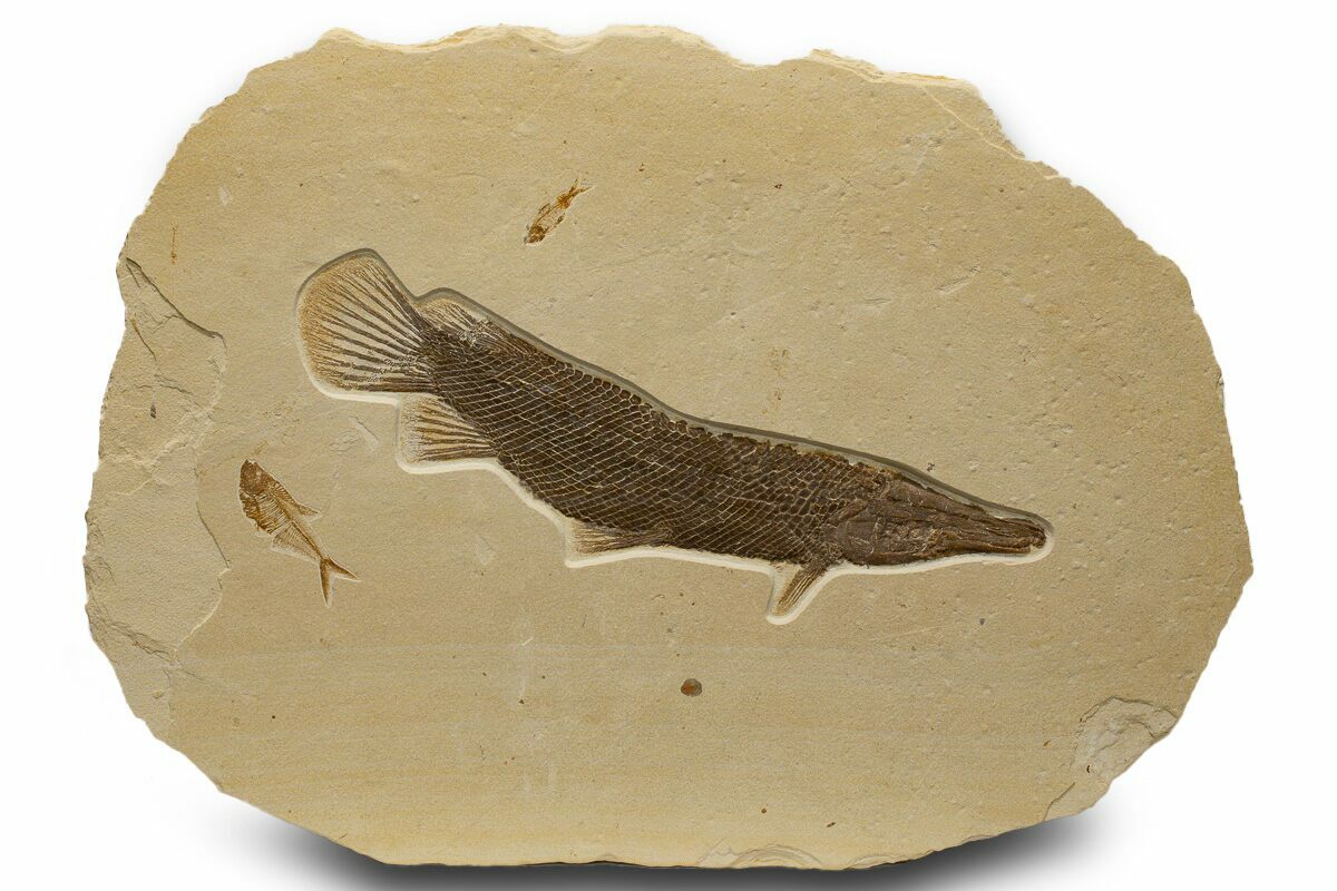 Gars are one of the largest and rarest fish found in the Green River Formation. Atractosteus simplex, sometimes called the "simplex gar", was a fierce predator, having a medium-length snout and jaws full of sharply pointed teeth. They also had 12 tail-fin rays and smooth sided scales which are beautifully preserved in this specimen. This gorgeous specimen measures 19.3" in length, with the largest known fossil of the species being about 28" long.