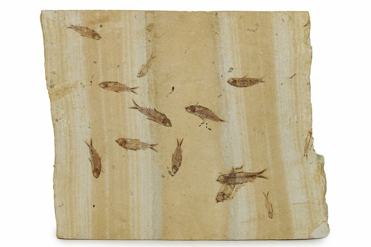 This is a fascinating, fossil fish mortality plate from our Fossil Lake Safari quarry near Kemmerer, Wyoming. This comes from a colorful, volcanic ash layer in the quarry which produced a mass fish, die off. There are thirteen detailed fish preserved on this 19 x 16" slab of shale, twelve Knightia eocaena and one Diplomystus dentatus.