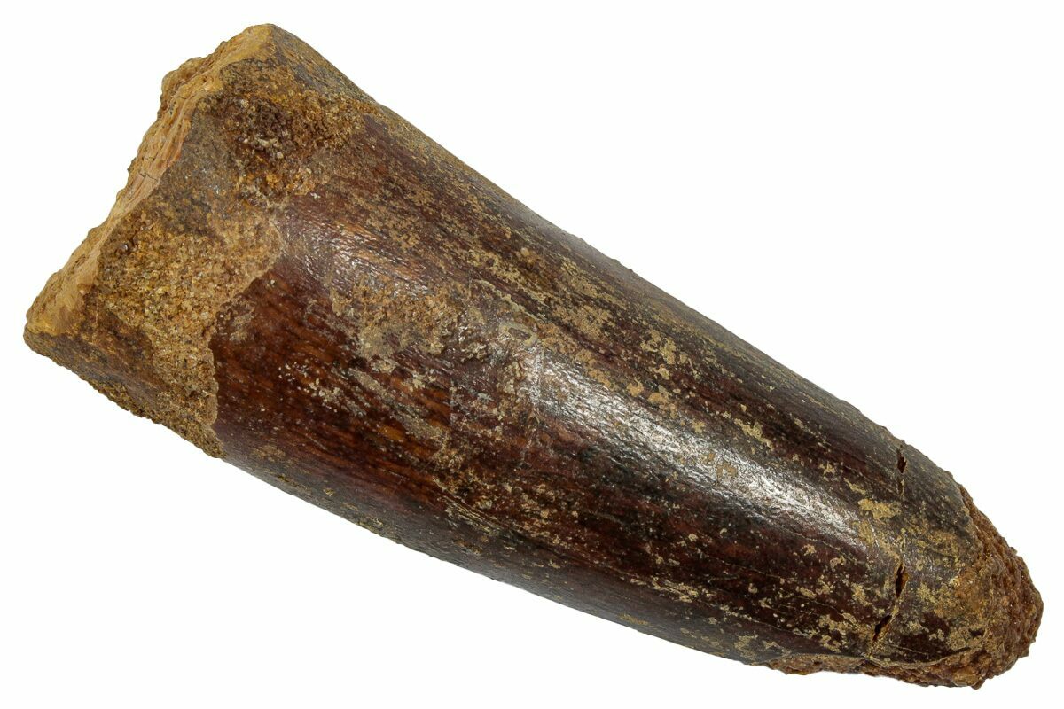 Spinosaurus teeth are relatively common fossils, but large (3+ inches), well-preserved examples are rare. These large Spinosaurus teeth will often be heavily doctored. We’ve seen many examples where multiple partial teeth can been glued to together to create a larger fake tooth, or where enamel has been painted on. One giveaway to look for is a ring of sand around the middle of the tooth, usually glued on to hide a break. Sometimes this is a sign that multiple partial teeth have been composited, but other times it is used to disguise a badly done repair job.
