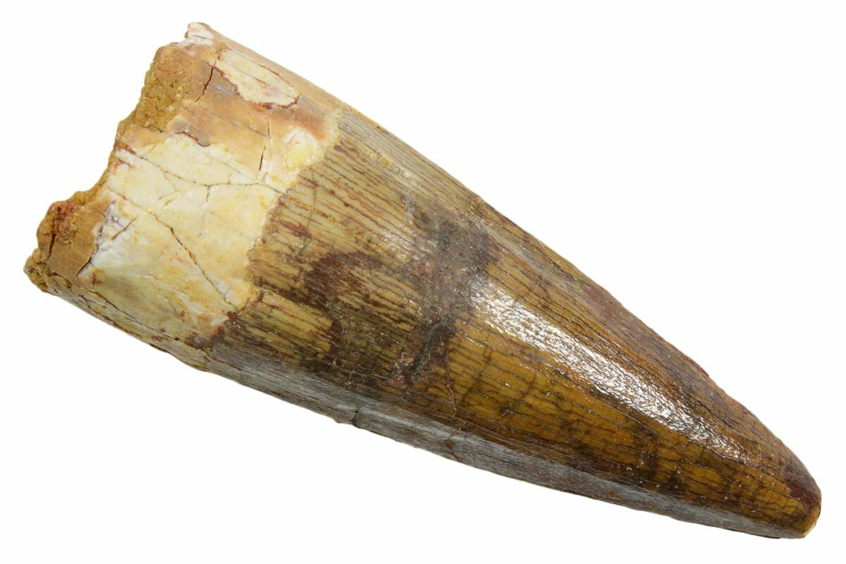 Spinosaurus teeth are relatively common fossils, but large (3+ inches), well-preserved examples are rare. These large Spinosaurus teeth will often be heavily doctored. We’ve seen many examples where multiple partial teeth can been glued to together to create a larger fake tooth, or where enamel has been painted on. One giveaway to look for is a ring of sand around the middle of the tooth, usually glued on to hide a break. Sometimes this is a sign that multiple partial teeth have been composited, but other times it is used to disguise a badly done repair job.