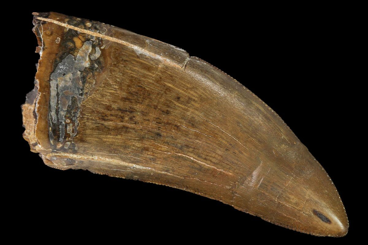 The tooth has nice enamel preservation and fine serrations along both edges. There is one repaired crack near the tip with some gap fill restoration in the crack.