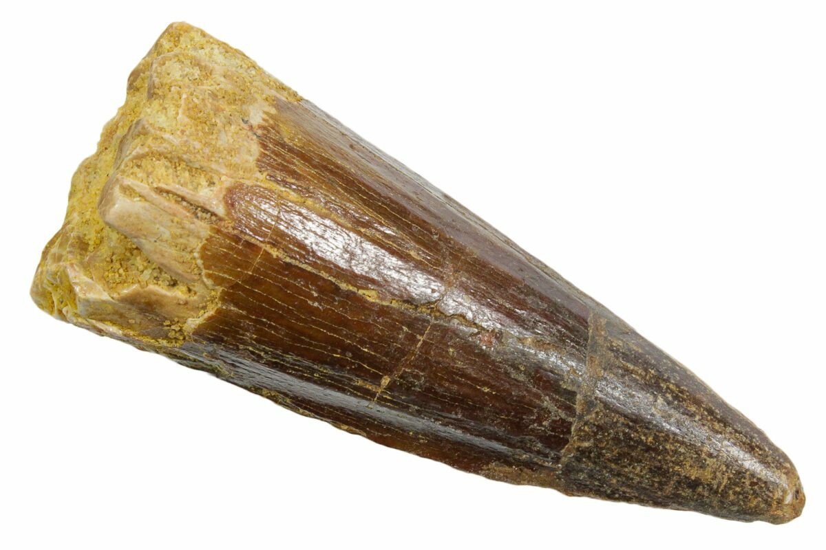 Spinosaurus teeth are relatively common fossils, but large (3+ inches), well-preserved examples are rare. These large Spinosaurus teeth will often be heavily doctored. We’ve seen many examples where multiple partial teeth can been glued to together to create a larger fake tooth, or where enamel has been painted on. One giveaway to look for is a ring of sand around the middle of the tooth, usually glued on to hide a break. Sometimes this is a sign that multiple partial teeth have been composited, but other times it is used to disguise a badly done repair job.