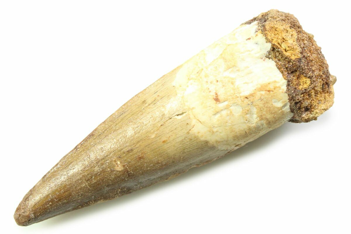 This is a 2.02" long Spinosaurus tooth from the Kem Kem Beds of Morocco. It is Late Cretaceous in age, approximately 95 million years old.