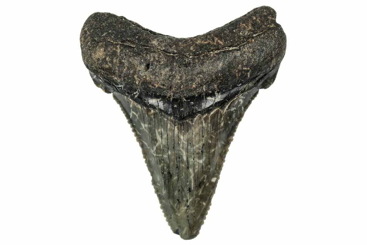 This is a serrated, 2.020" long fossil Otodus angustidens shark tooth. Angustidens is believed to be an ancestor of the fearsome megalodon shark, though it did not grow nearly as large.